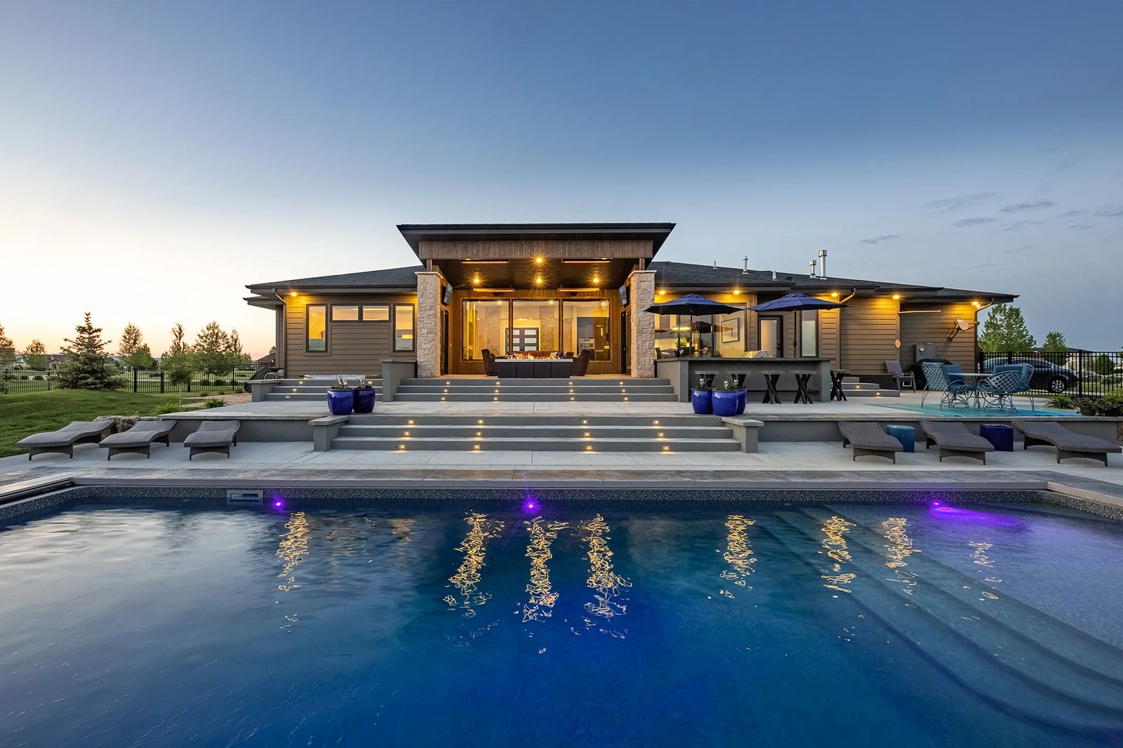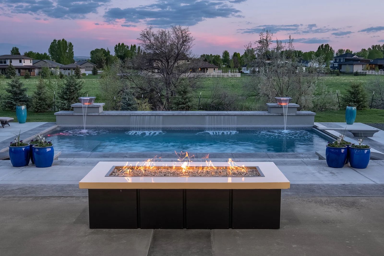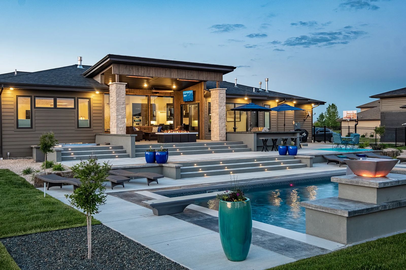 Kari is ecstatic when talking about their extended outdoor living area. "The pool is perfectly positioned for the sun. And, the fountains (bowls) are beautiful at night, changing color with the lights. Three levels of concrete stairs are lighted, too, and they really pop at night!" A fire pit also lights up the atmosphere, while a low diving board adds a finishing touch.
