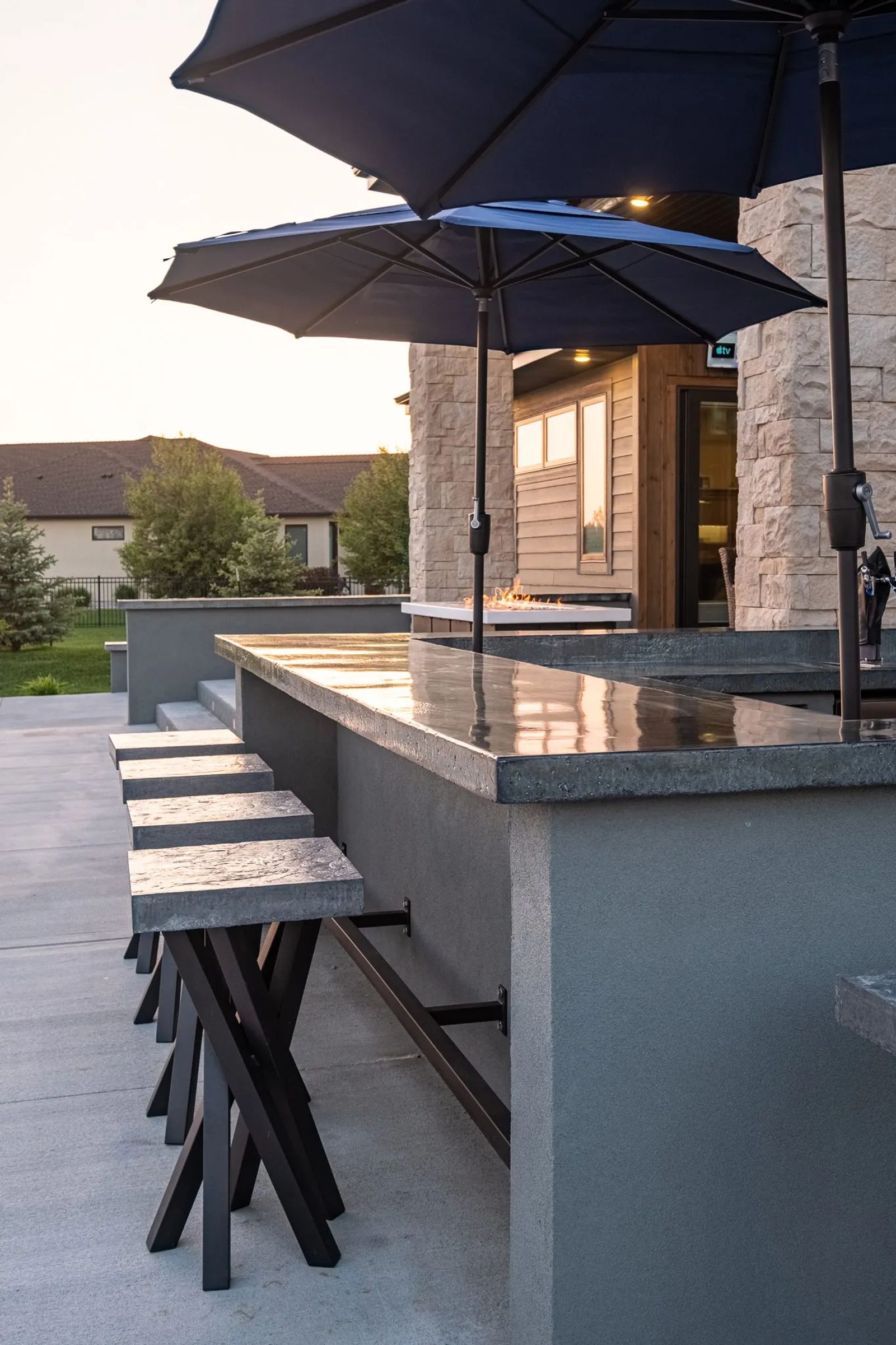 On the open end of the patio sits an outdoor kitchen constructed in concrete. Barstools are made of concrete and metal. Additional metal in the form of wrought iron fencing encloses this meticulously landscaped sanctuary.