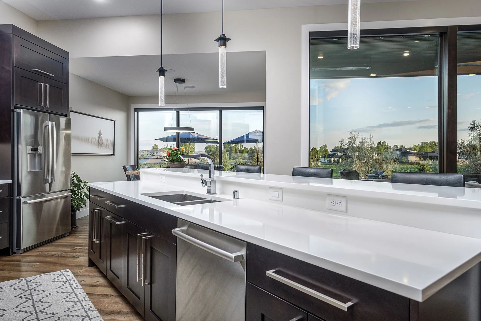 Light from the pendants dances over white quartz countertops and reflects off white glass backsplash. Maple cabinets stained in cocoa brown enhance the clean look this kitchen embraces.