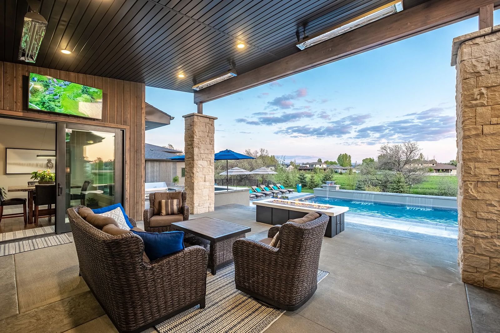 A built-in sunken spa adds to the backyard oasis, sitting just off the upper covered patio that's complete with two TVs, surround sound, and four ceiling heaters. "Gray makes fun of me and my friends when we're out here with wine and blankets with the heaters on," laughs Kari. The deck also makes the preferred spot for Maggie, the family dog. She keeps an eye on everyone from her perch above the pool.