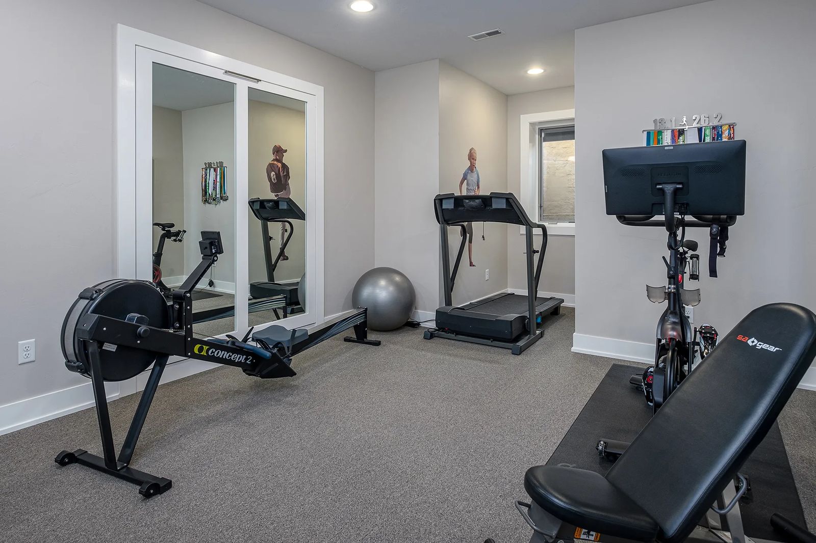 Kari visits this space often as the workout room is one of the many rooms in this super-size area. Her antique jukebox from the old McCloud Bar on the Boulder River sits in the corner of the main area by the pool table.