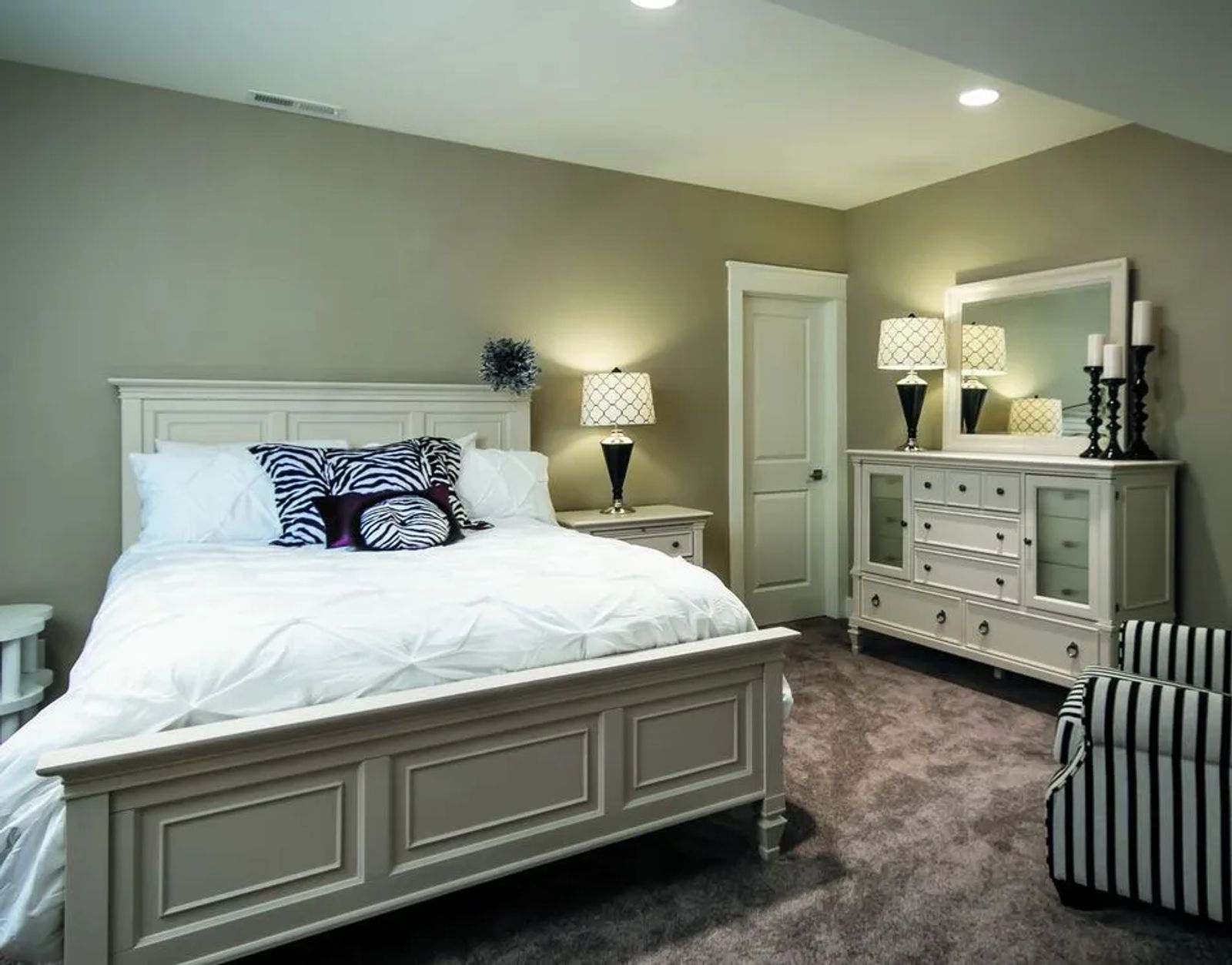 This plush bedroom expresses masculinity and femininity at the same time. Carrie shows that a more neutral or masculine look is derived using an over-sized dresser. She also accommodated the feminine approach with a smaller dresser and stylish bed cover. Pillows also soften the look and add a pinch of color. This arrangement works well with most couples. “It’s finding a happy medium,” notes Carrie.