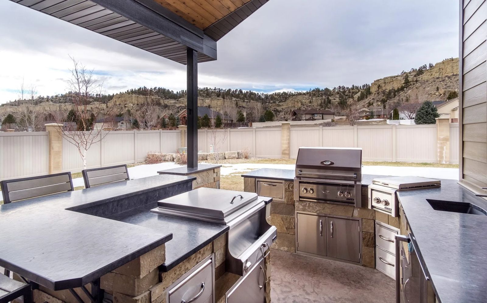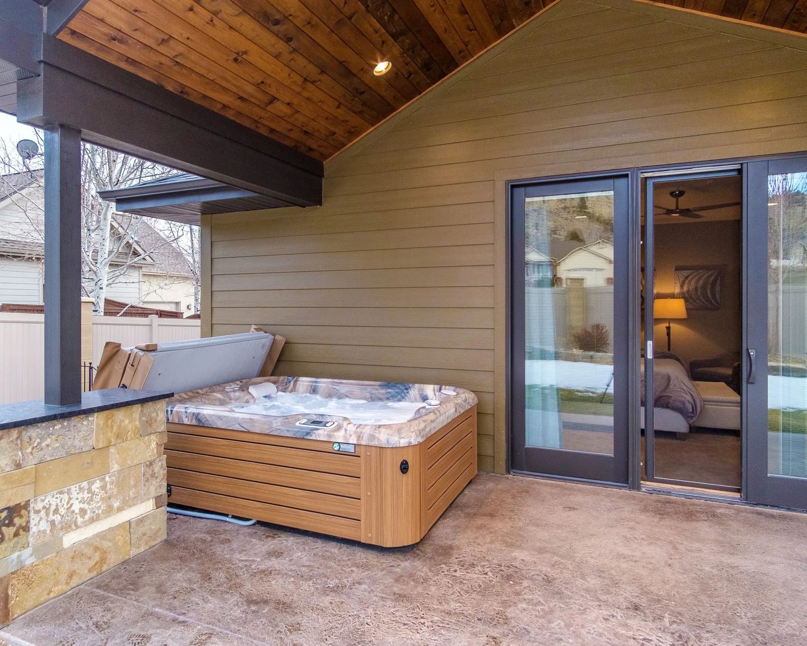 Stationed below the built-in Jenn-Air coffee maker is a small appliance. Janet opens the door exposing a little wine fridge. “You gotta have it for the hot tub,” she sings. From Montana Hot Springs Spa, the oasis waits patiently on the couple’s private patio.