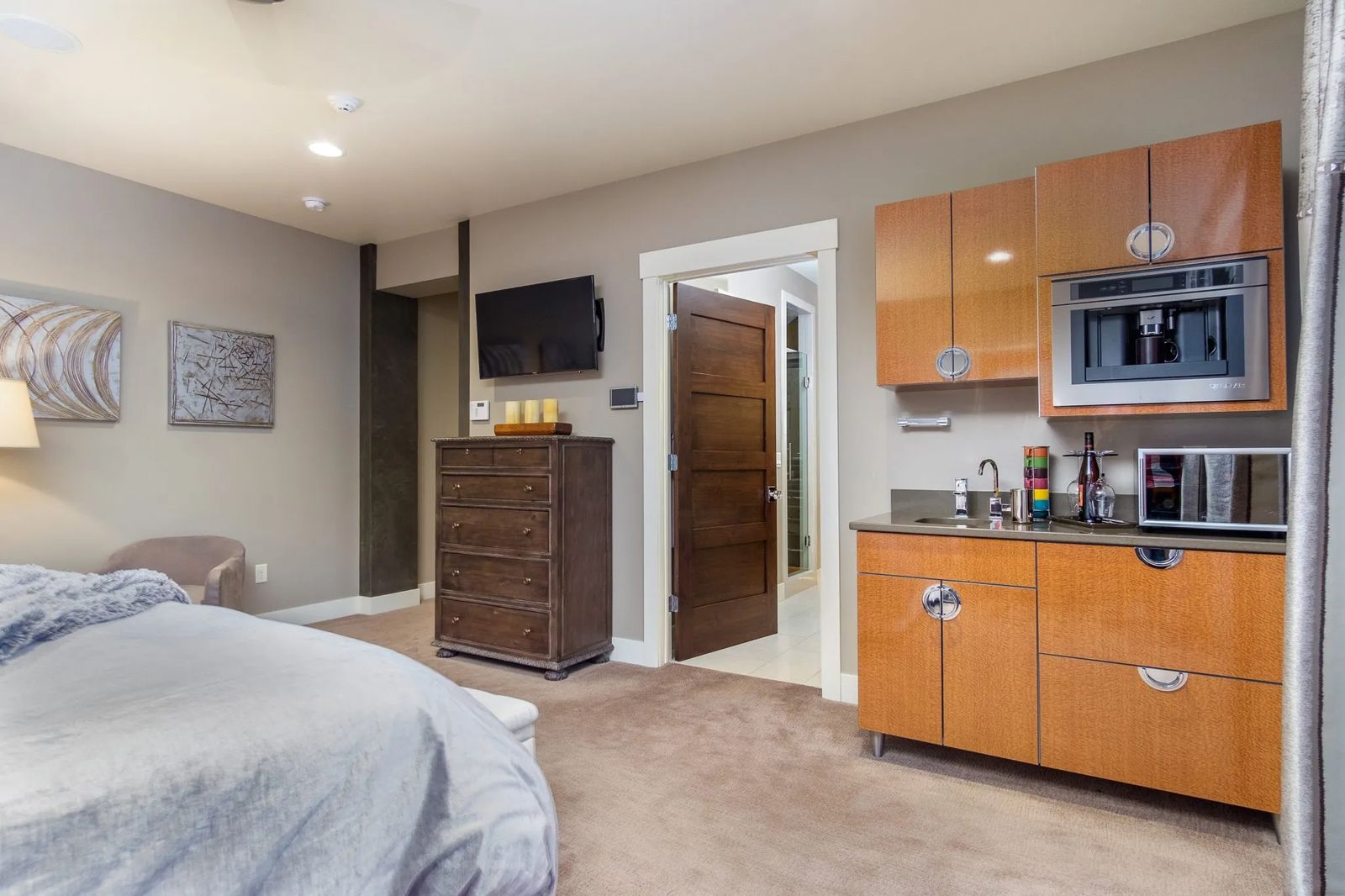 Another feature incorporated into this stylish room “looks like a piece of furniture,” says Sheldon. A sophisticated coffee bar crafted from engineered wood with high gloss finish and chrome accents make an efficient morning coffee stop for Allen. “Allen loves coffee in the morning,” acknowledges his wife.