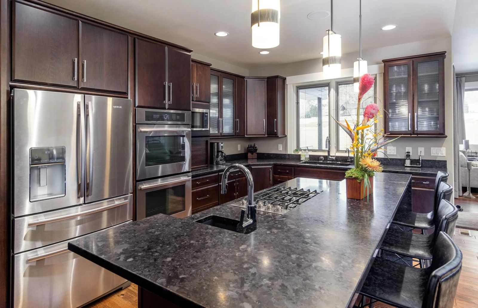 Beyond the dining area, a black “broken-face” granite fireplace with a floating black quartz hearth rises up to the ten-foot tray ceiling. This living space introduces the beauty of refined furniture from Davidson Home Furnishings & Design. A very modern Italian gray leather sectional drapes the room with comfort and high style. “It’s a fun statement piece,” says Davidson Design Associate Kara Dahlberg. “You can raise or lower the sofa backs for different looks.” Kara continues, “One of their main wants was two comfy chairs to sit in the corner of the room. It’s a timeless look.” A window behind each oversized chair provides clear views to sun-drenched trees along the rims. “We see people walking and biking the trail all the time,” points out Janet. “We sip our coffee here on weekend mornings.”