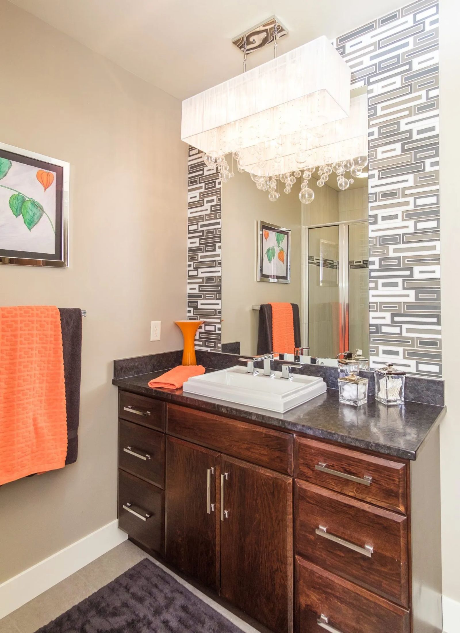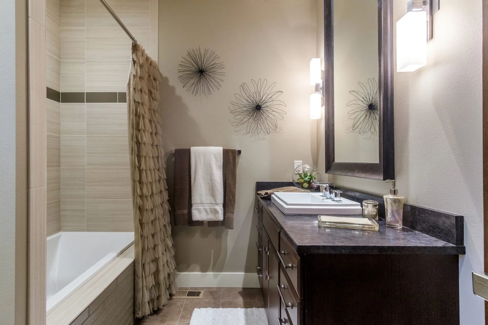 Dark-framed mirrors positioned over separate counter-resting basins echo the distinguished details enveloped in the home. Shapely trio pendant lighting dangles over black granite and the creamy porcelain tile flooring provides a brilliant contrast. Square crystal doorknobs intensify the chic ambiance.