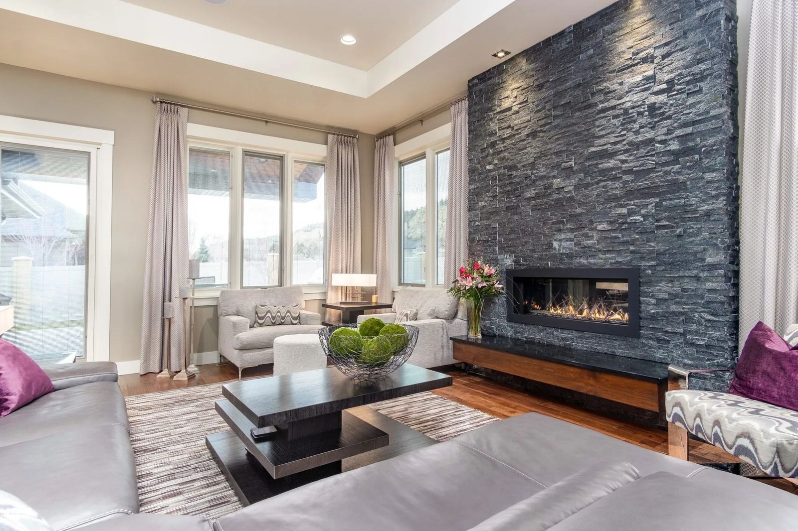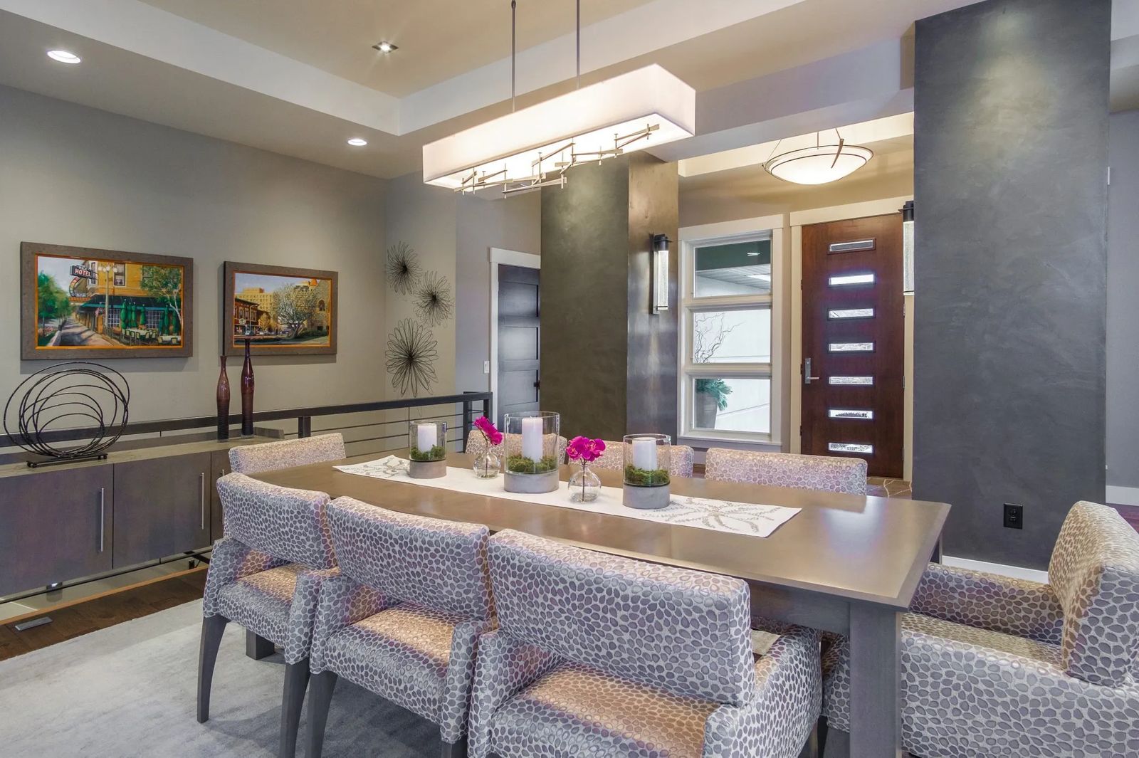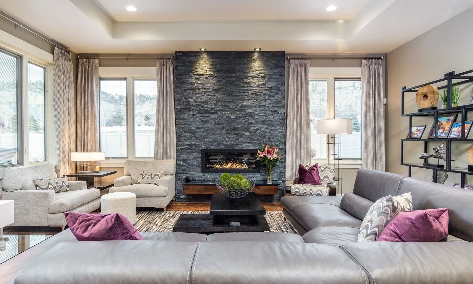 “Janet likes color,” notes Kara. “It was fun choosing the different window coverings — the chartreuse in the office, the plum in the living room, and the silver taupe in the guest bedroom and master bath. Drapery is a way to warm it up around the windows.”