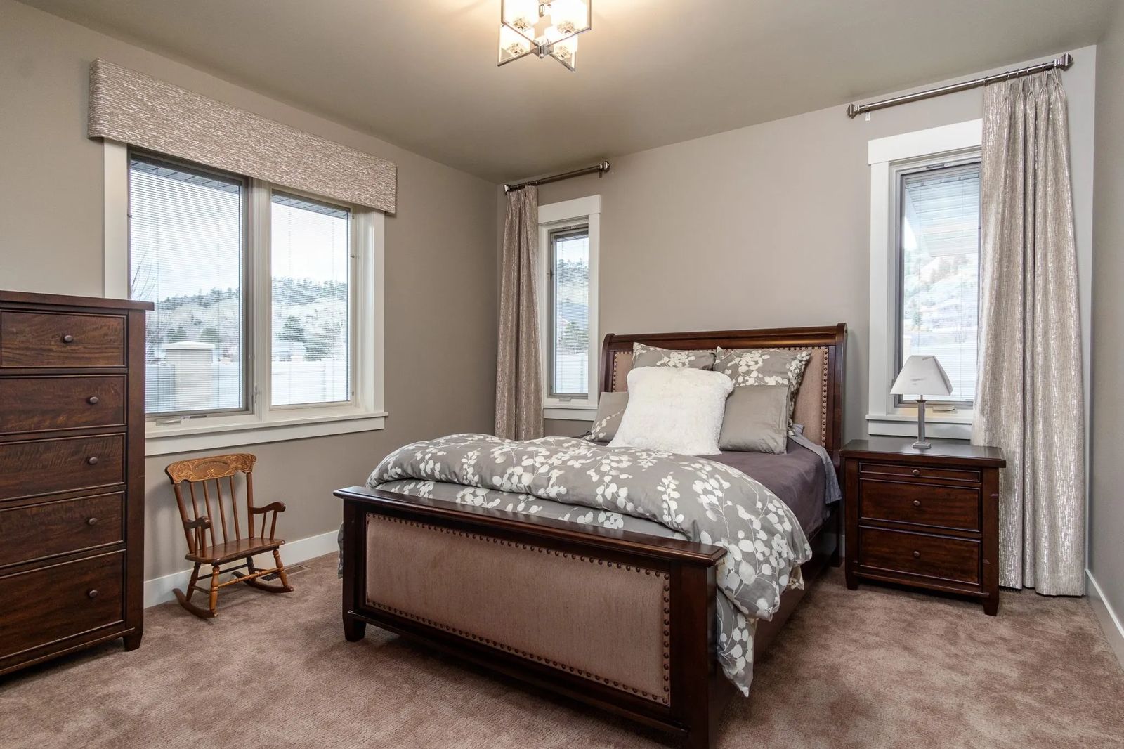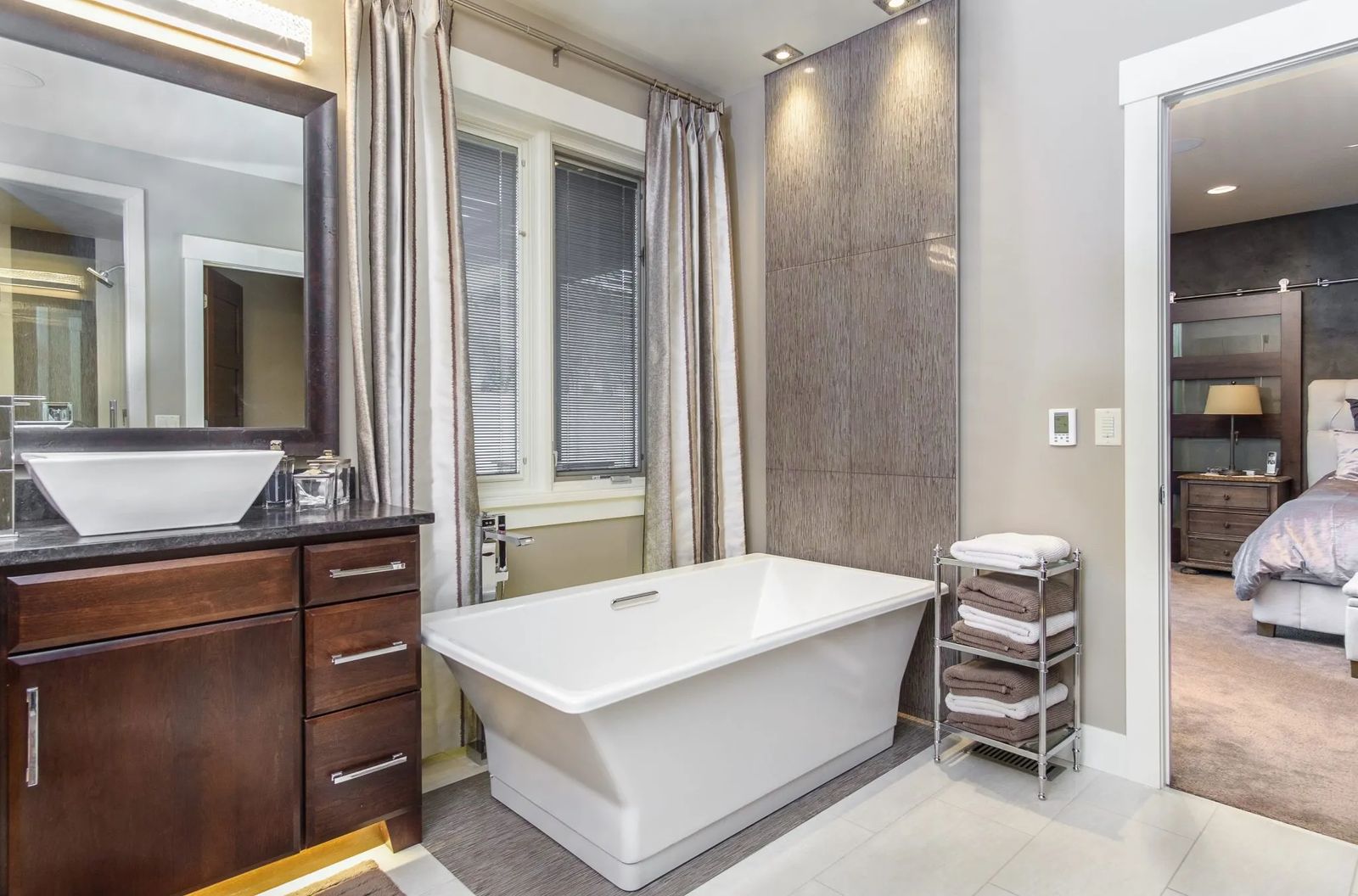 The rich-looking draperies in the guest room shimmer against the tall windows that offer another fabulous view displaying the manicured landscape meticulously planned by Billings Nursery. Guests may never wish to leave.