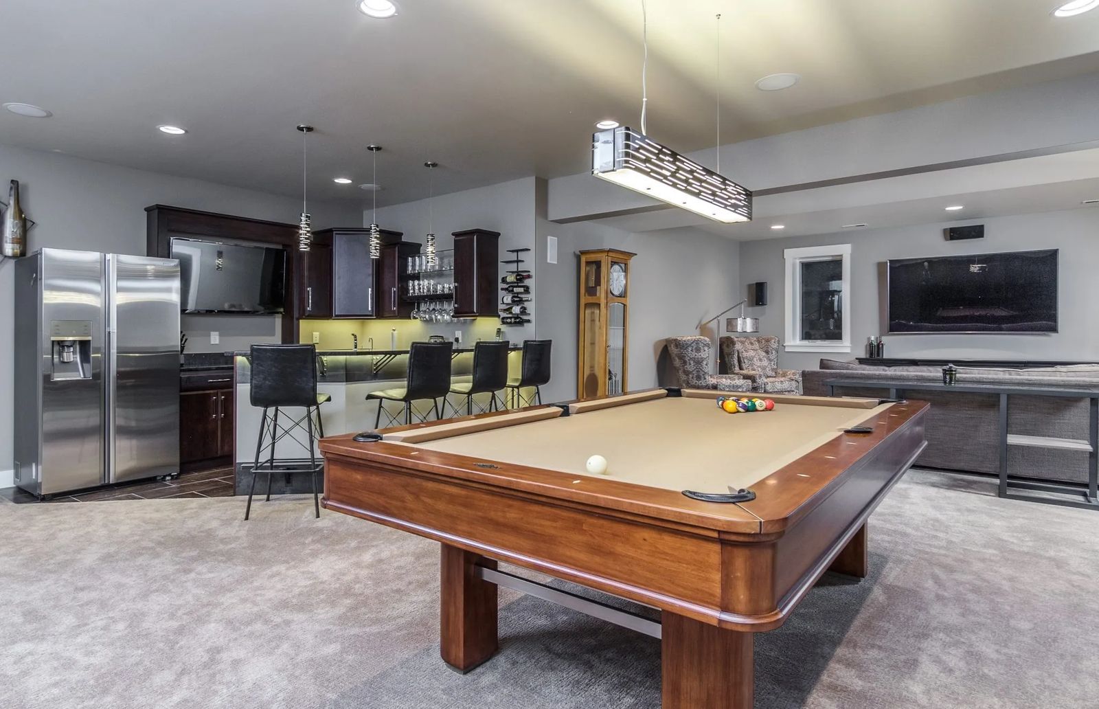 The nearly 6,000-square-foot spacious abode comes complete with its own man-cave, otherwise known as the garage. The roominess seems unnoticeable from the outside, as, a bump-out covered with the natural stone, cleverly obscures the look of a six-car garage. “We built the house around the garage,” laughs Janet.