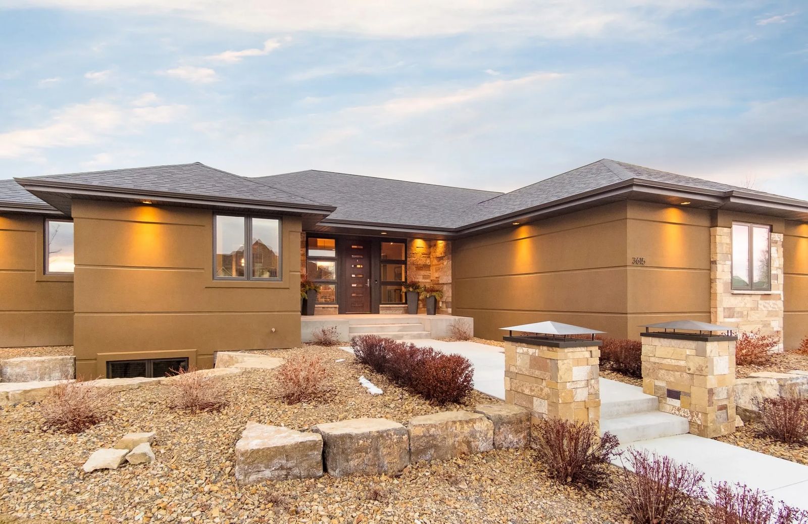 This spectacular home near Zimmerman Trail built by Eaton & Yost Construction Company features fine details in every shape and form. Its textured exterior offers a clean look and the dry-stacked natural stone front entrance pays homage to the sandstone rims looming behind the home.