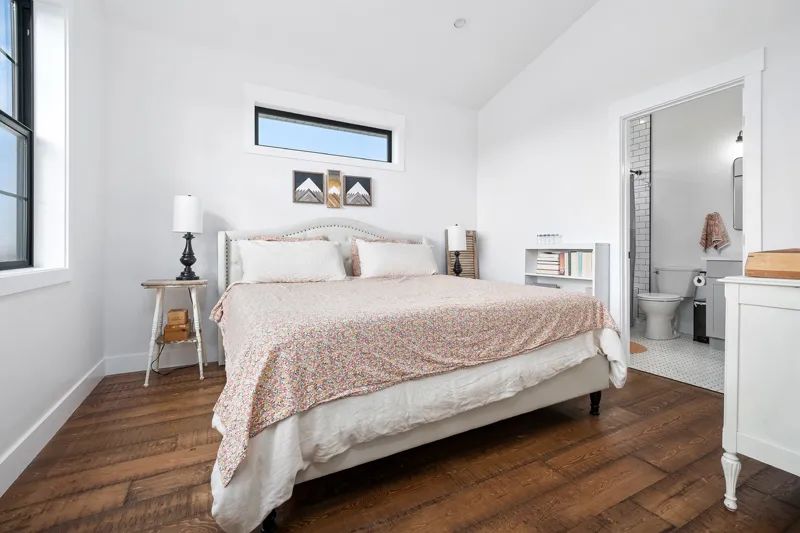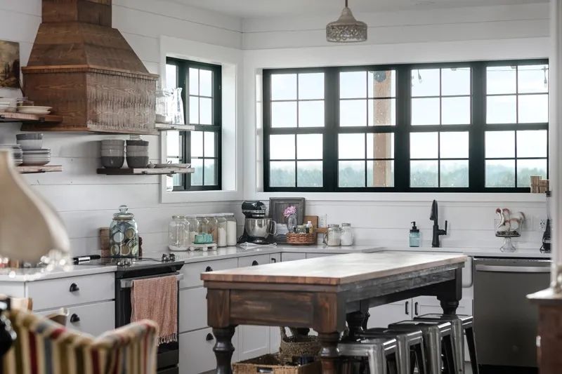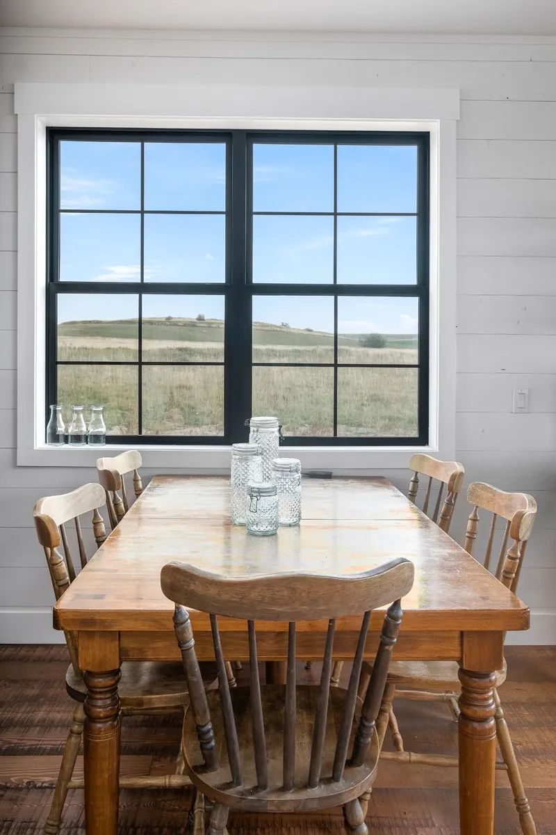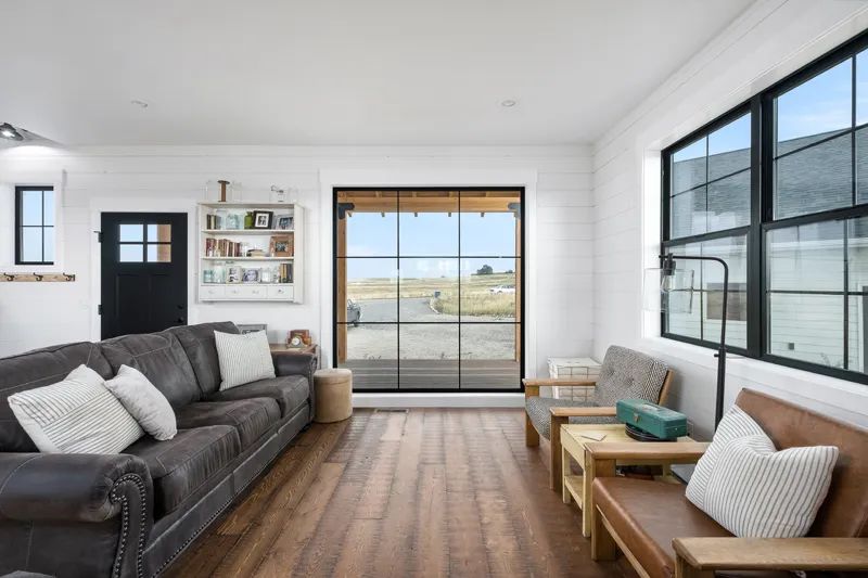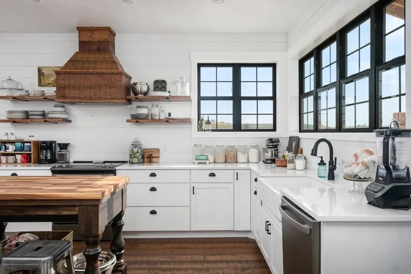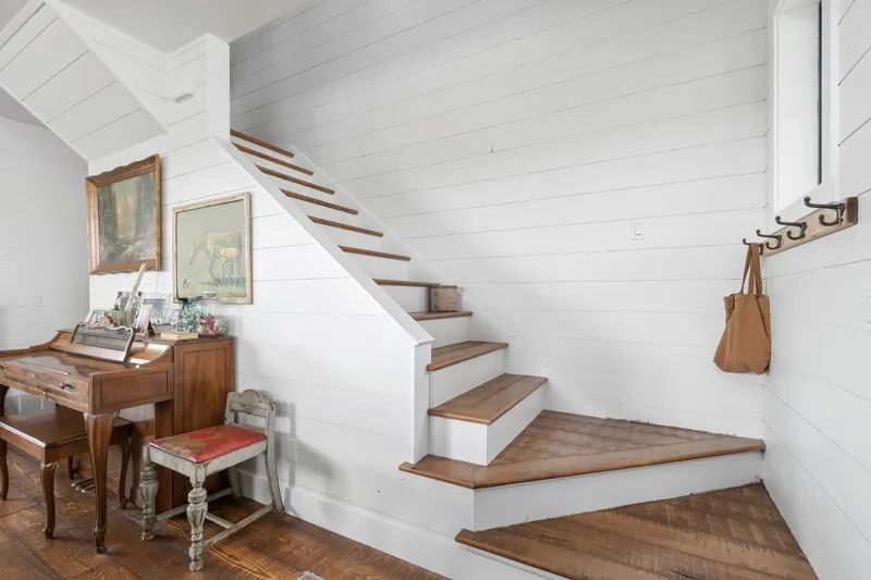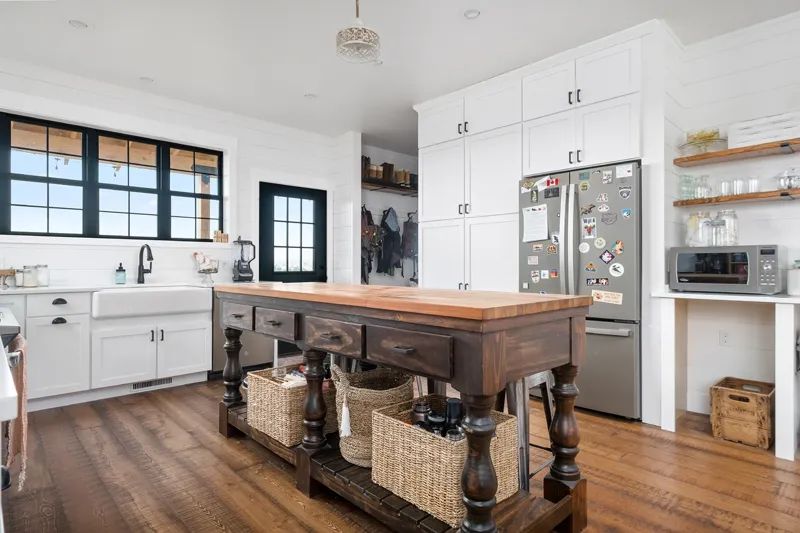 The distinctive windows emphasize the exterior’s traditional white farmhouse look, as well as the interior’s stunning shiplap walls. Even the staircase is framed in shiplap, and the stair treads leading up to the second-level loft area are skip-sanded fir and larch stained flooring.