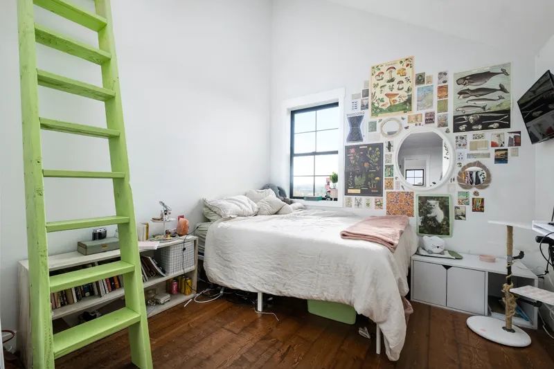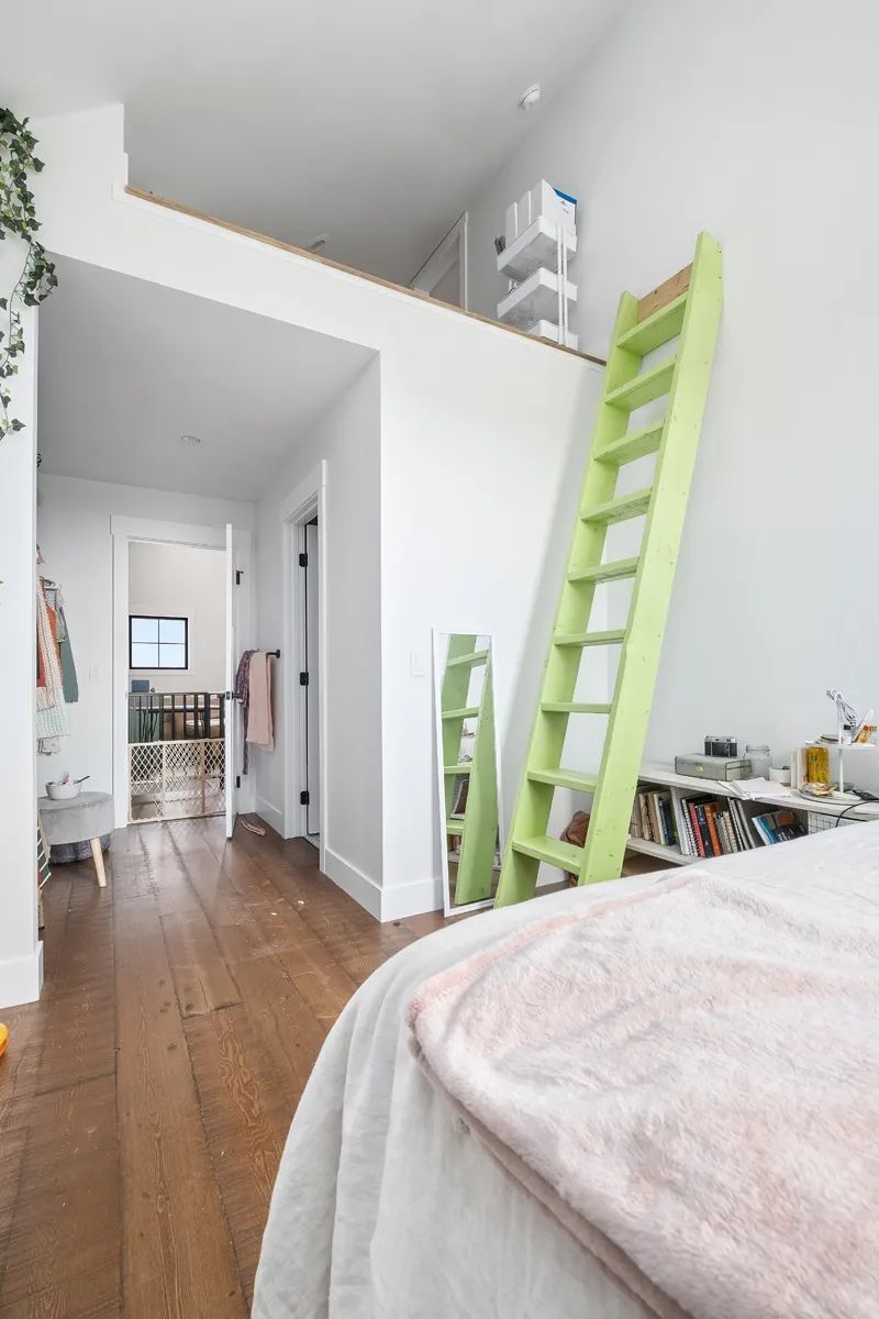 “Each girl had to sand and finish the ladder up to her loft,” David says. One ladder is green and the other is yellow.