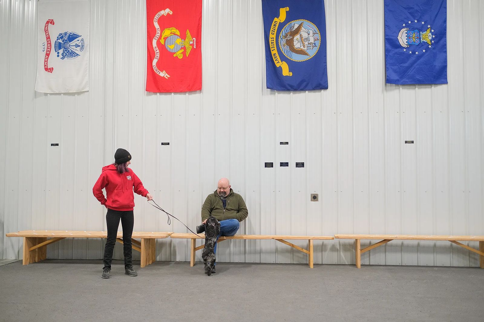 Austin and Chief are learning basic obedience at the Dog Tag Buddies training center, a warehouse space east of Billings on the way out of town. Flags for every branch of the military as well as POW-MIA and the American flag are draped across the walls. The expansive room looks like a gym for dogs.