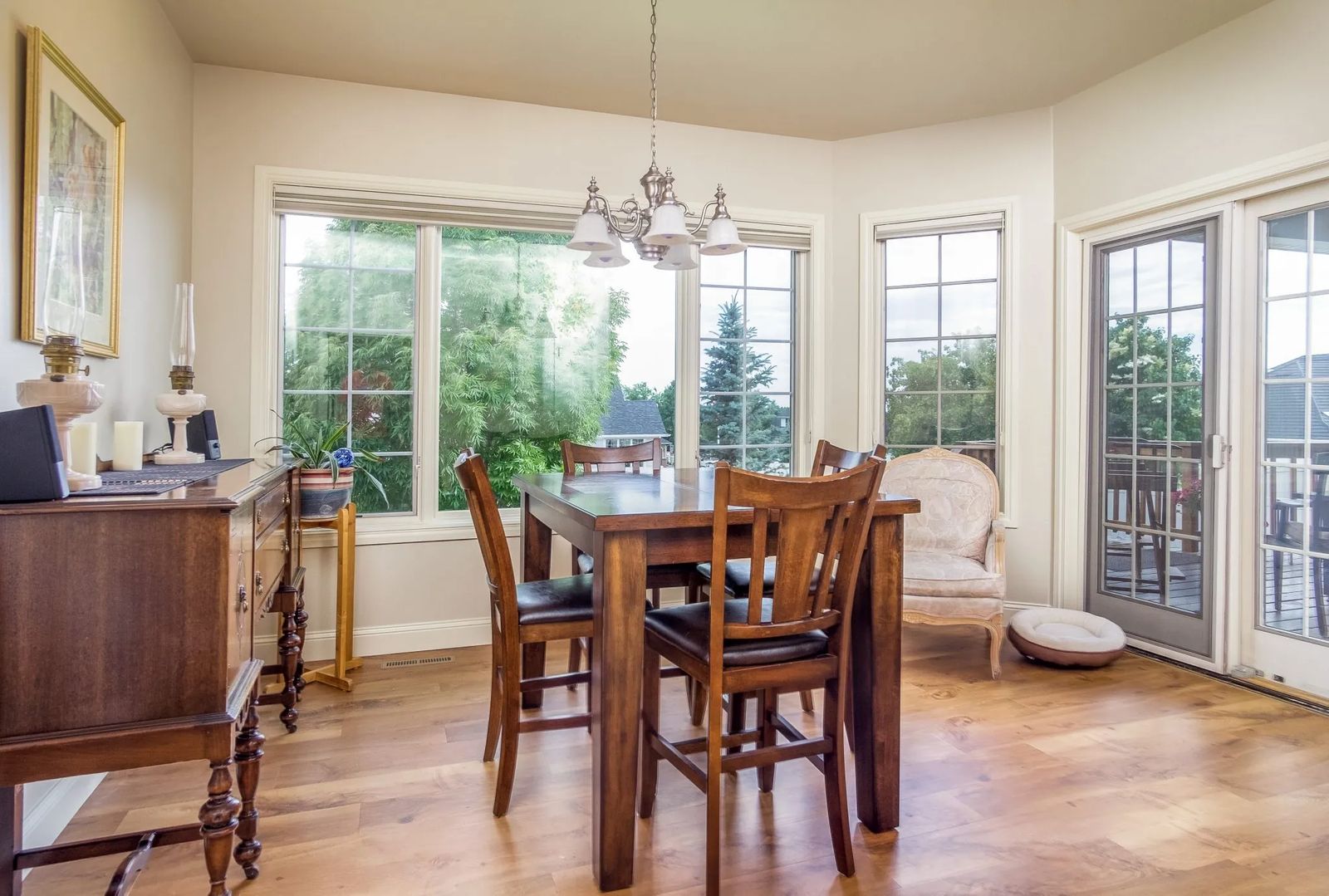 To the back of the home is the couple’s new dining space. Sitting just off the end of the kitchen, warm maple flooring from Pierce Flooring continues into this cozy eating area while natural light spills in through sliding glass patio doors. An easy access walk-in pantry has been included in the design, supplementing this major home re-do with even more storage.