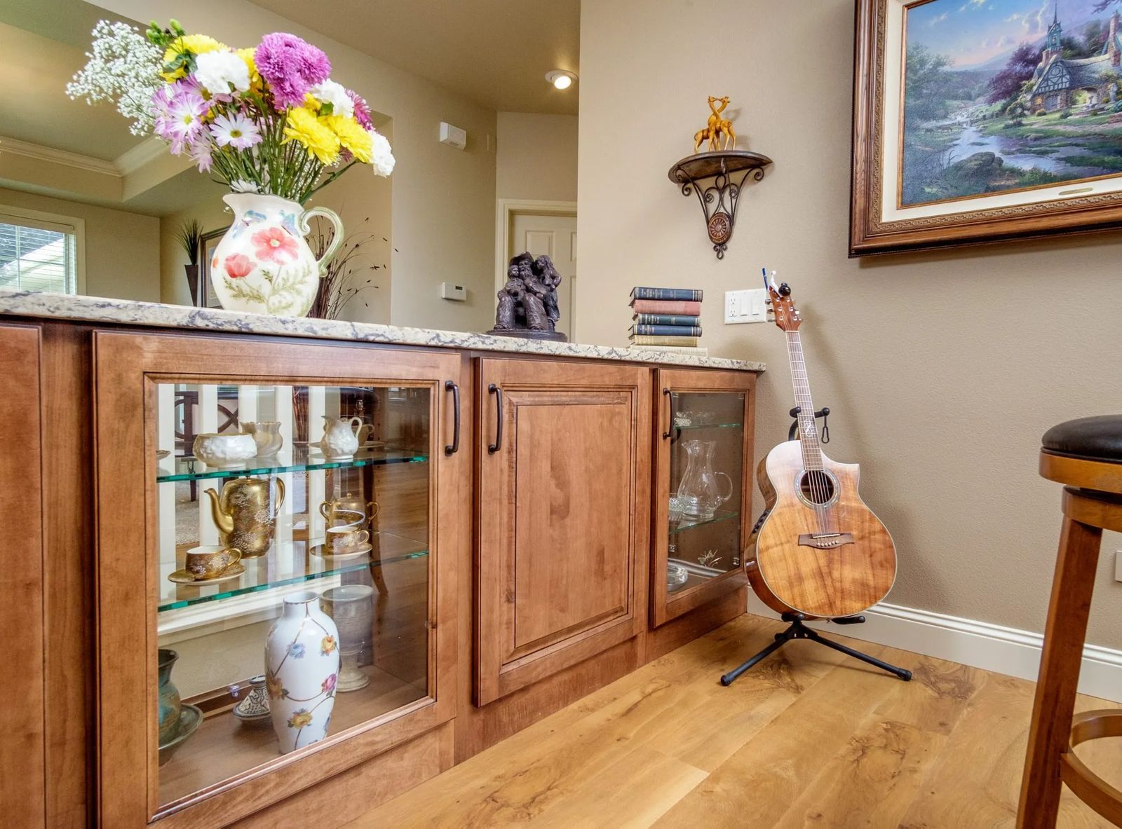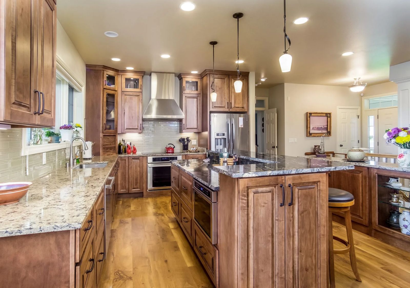 Accommodating every aspect of entertaining, a center titanium granite island with raised bar top bestows stunning appeal with its dark caramel veining. Three pendant lights from Rimrock Lighting drape gracefully above while the island benefits the homeowners with ample storage opportunities.