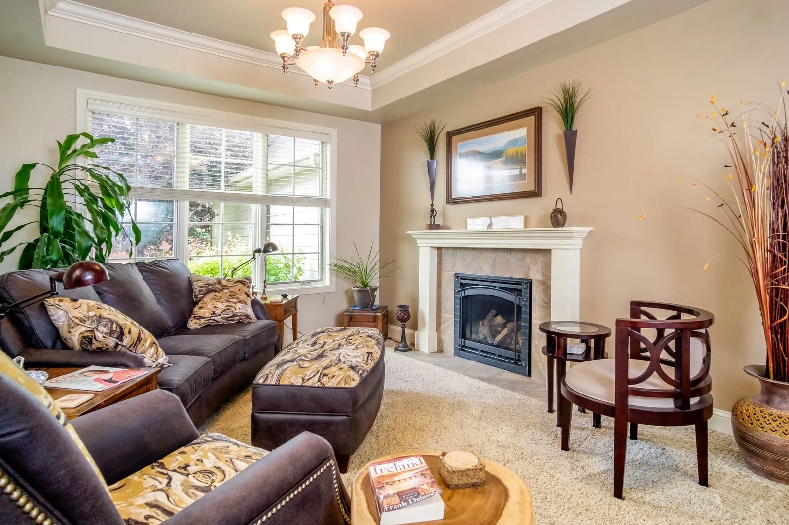 “The sitting room is a now nice place to sit and talk,” notes Steve. With the fireplace relocated to this space, grand ambiance fills the room. The fireplace’s classy modernization balances the room’s tray ceiling and fine leather and fabric furnishings from Conlin’s Furniture.