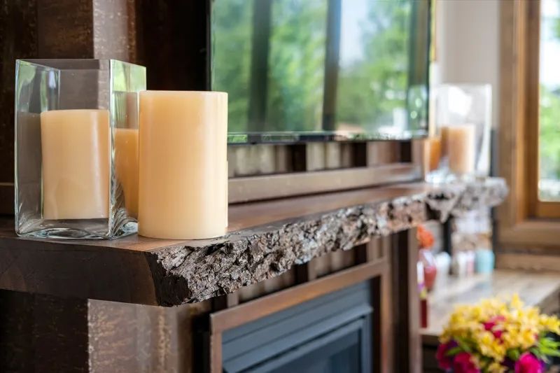 The serving tables enhance the rustic, yet elegant look of the floor-to-ceiling gas fireplace. “It’s a corrugated steel front,” Darian says. “The steel rusted as it lay out in the weather. This is why you see the variation in it. The mantle is a solid three-inch piece of walnut I had shipped in from Salt Lake City.”