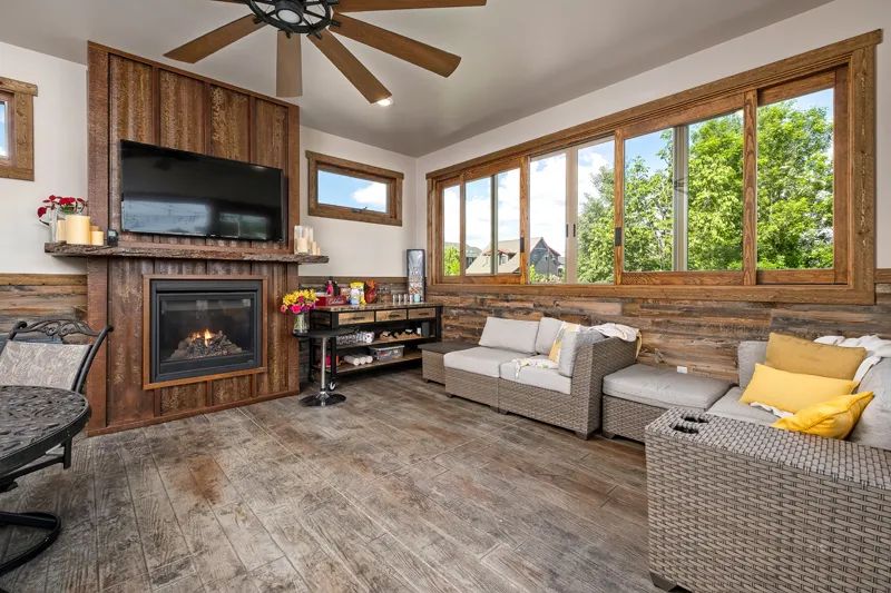 The addition has come together beautifully, creating a warm, inviting living space where the family spends quality time. It’s an easy maintenance area featuring a stamped concrete floor replicating wood plank flooring in light-to-medium tones. Reclaimed snow fence wood covers the lower half of the walls, giving off a rustic vibe. The window and door trim are stained to match.