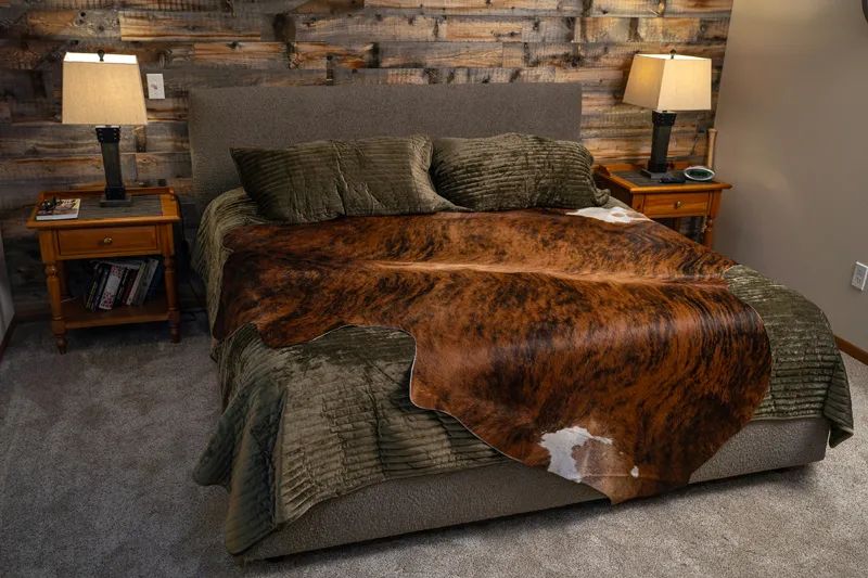A throw rug or bed accent can convey a rustic yet refined Montana style. This beautiful cowhide from Western Ranch Supply can serve as either. As Marketing Manager Shelbi Bradford says, “Cowhides add a rich feel to a space and lend that Montana look we all love. They can easily match your room in tricolor, black and white, speckled and tan, or the brown and black brindle.” She adds that if you’re going for a western-inspired look, Western Ranch Supply has wall art, scented candles and plush throw blankets.