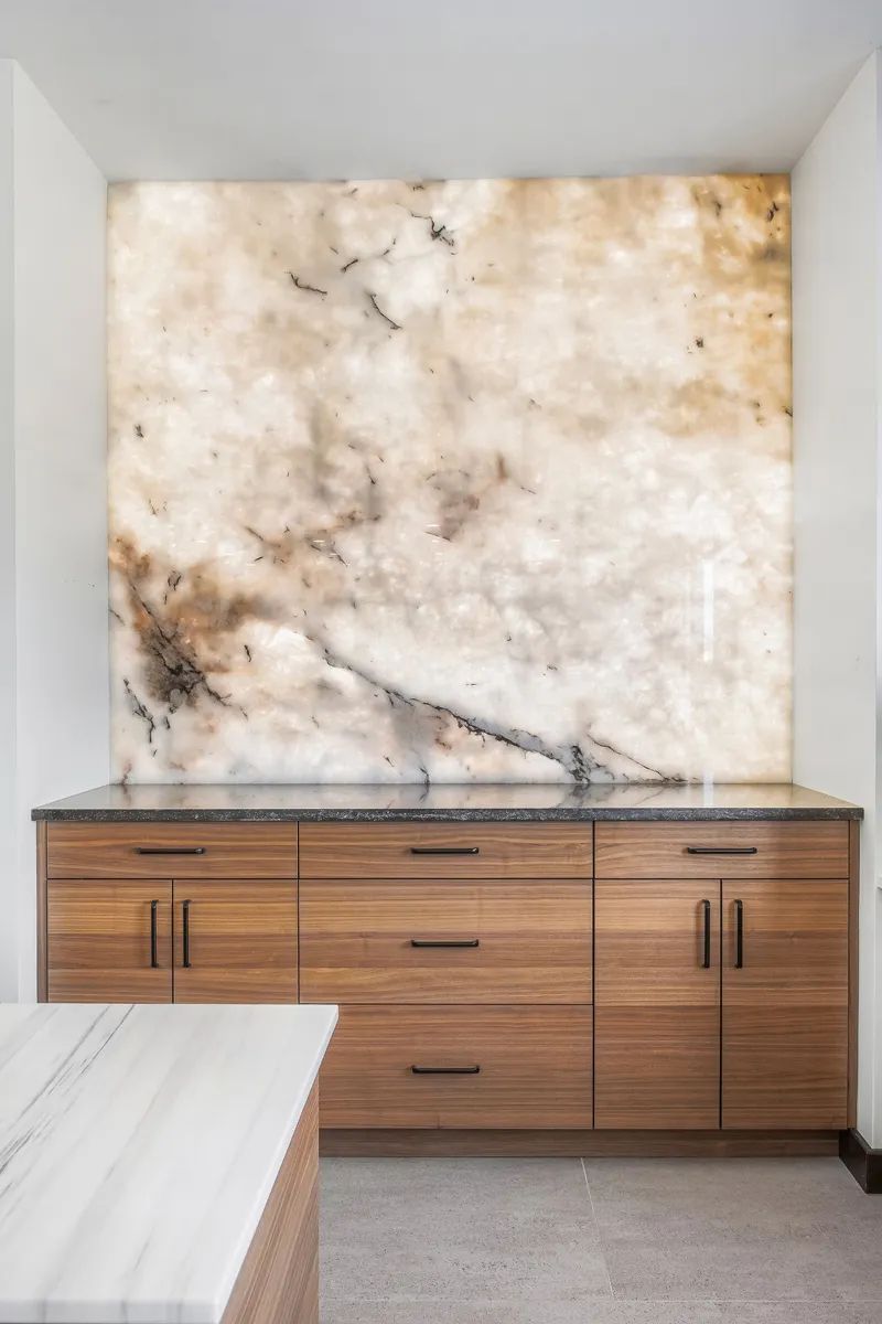 The Kales are also seeing homeowners move away from a traditional 4-inch backsplash and carrying the countertop all the way up to the base of the upper cabinets creating a bold and solid surface wall.