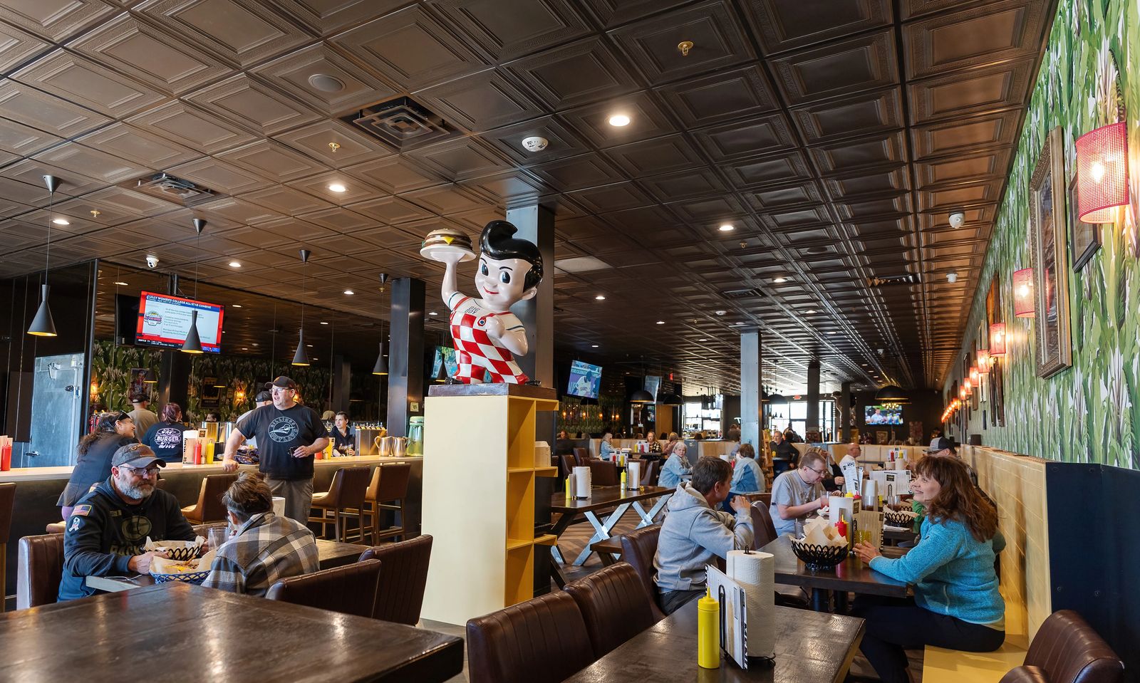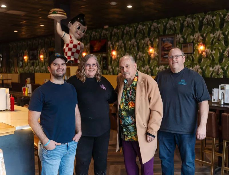 On this day, we sit in a booth located in the far back of their new restaurant in the West Park Promenade. Brad and Brendan are nearby. In early spring, they opened in the space that once housed Parasol, Midway and Phatty’s, right next door to Gainan’s Midtown Flowers. The modern industrial design from the previous occupants will remain, but a Bob’s Big Boy restaurant statue — a blue-eyed boy with fluffy hair and checkered overalls holding a burger — will be placed prominently near the front entry in keeping with their nostalgic vibe. The downtown eatery will continue to serve diners in anticipation of the opening of the Marriott AC Hotel next door, on which construction is scheduled to begin this summer.