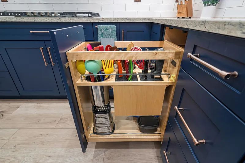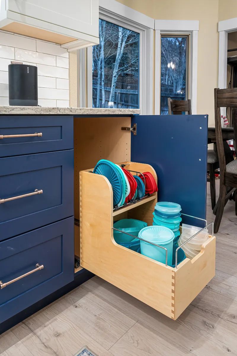 Included in the remodel were also space savers like drawers that pull out to store all Michelle’s plastic storage containers or another pull out that holds all her ladles, spatulas and whisks.