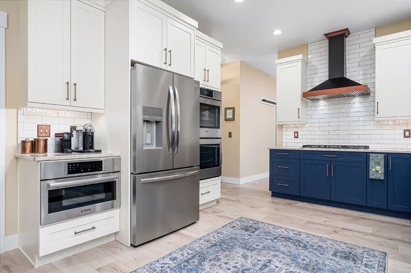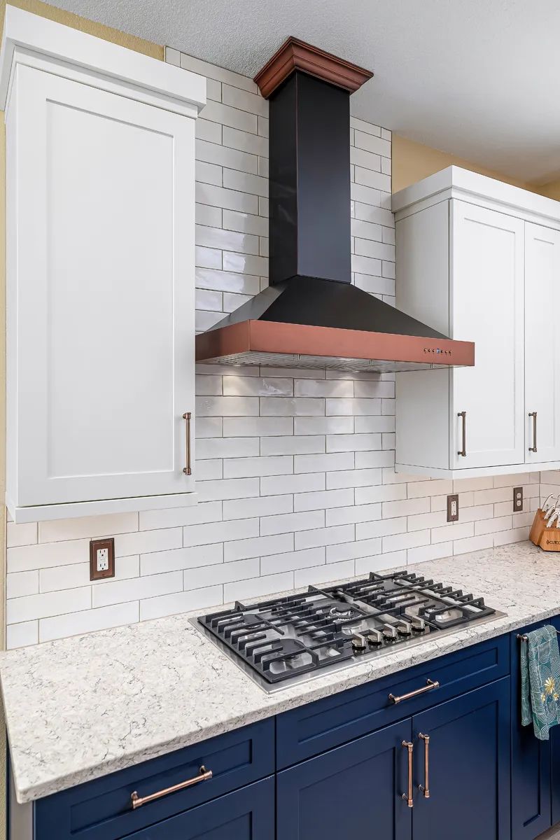 “Navy blue is my favorite color,” Michelle says. “I wanted one stand-out centerpiece in the kitchen and for me that would be the copper vent. It is an oil-rubbed bronze and copper wall mount range hood from Zline Kitchen and Bath. This combo makes me think cozy and relaxing.”