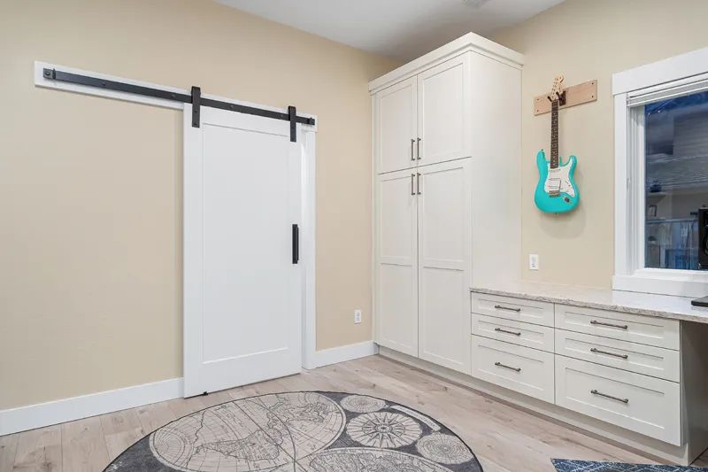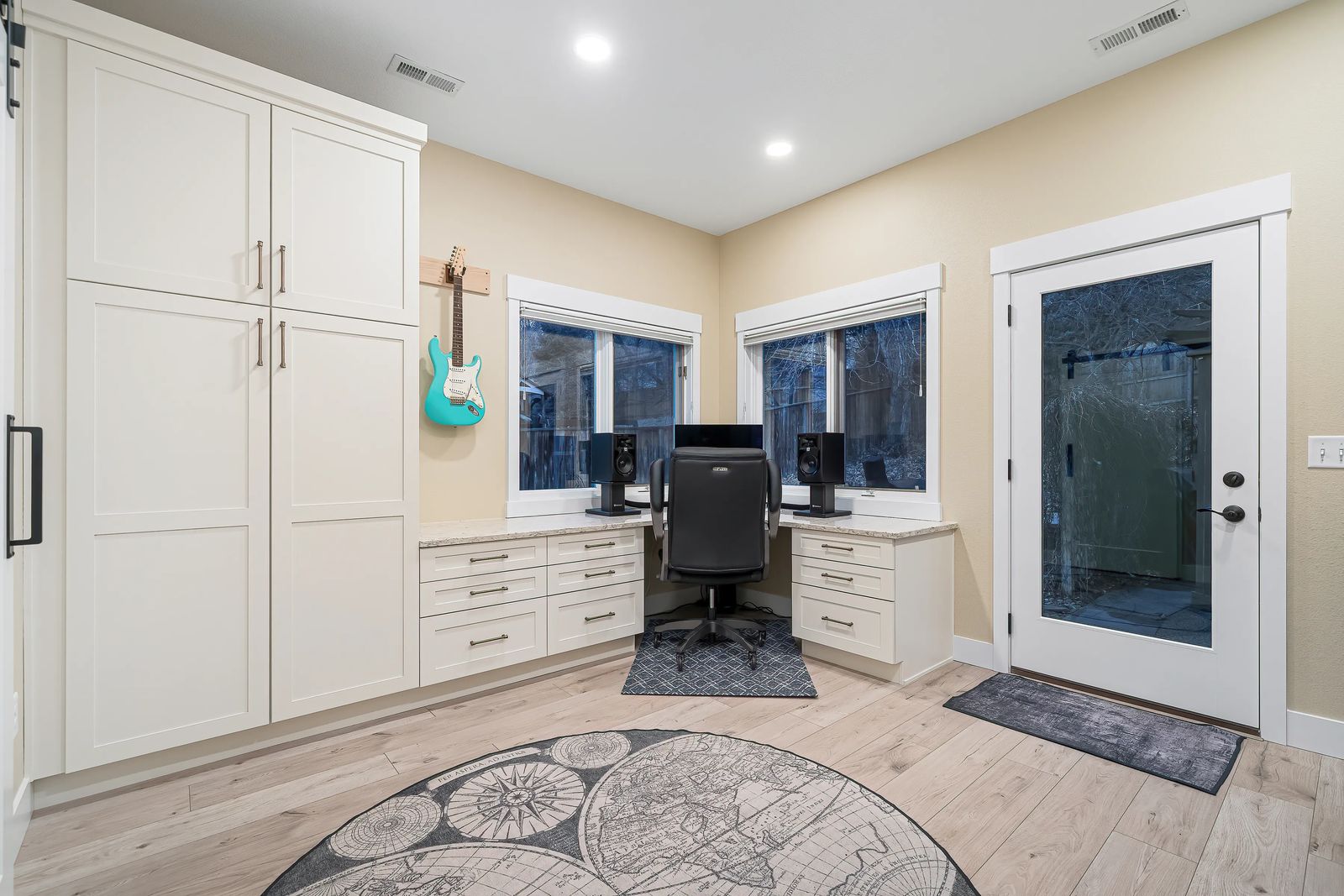 Just around the corner from the kitchen, you’ll find Brent’s haven. It’s a space he uses not only to build guitars but as a recording studio. It used to have counters and cabinets that were falling apart before the remodel. Today, it’s a streamlined space with plenty of storage for his guitar-related hardware.