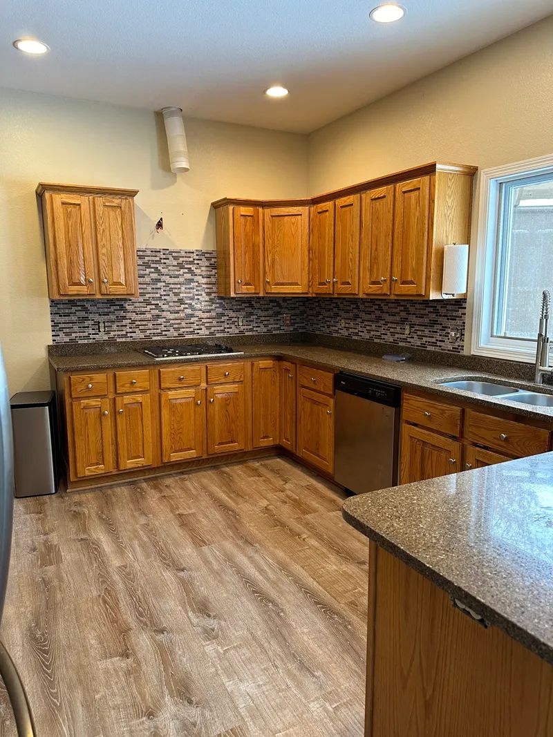 “The kitchen layout wasn’t optimal, and it was very dated,” Michelle says. “The original honey oak cabinets showed lots of wear and tear, and some doors wouldn’t close properly.” On top of that, she says, the layout of the cabinets didn’t have a good flow. They were oddly placed and didn’t allow for much storage. When you pair that with the dark counters and floors, Michelle says, it made the kitchen appear “unwelcoming.”