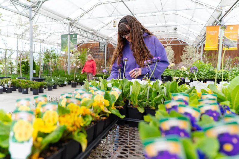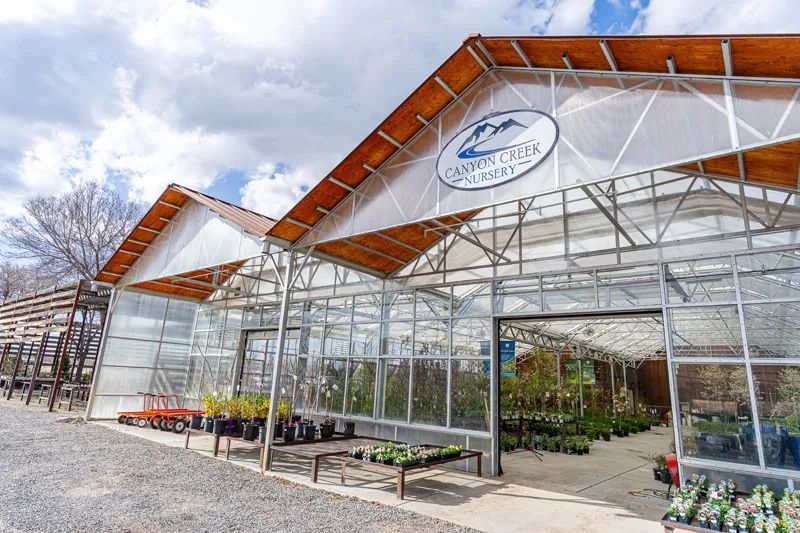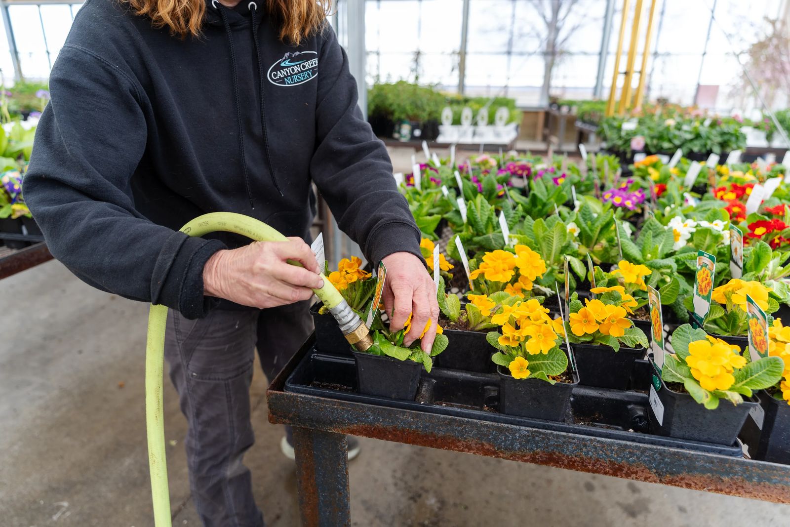As you step into the greenhouse at Canyon Creek Nursery, the fluffy little petals of a bright pink dahlia peek out from one of the nursery’s benches. A striking yellow forsythia bush in full bloom sits nearby. In the back, a woman is busy up to her elbows in dirt seeding sunflowers as another takes to watering the rows upon rows of perennials.
