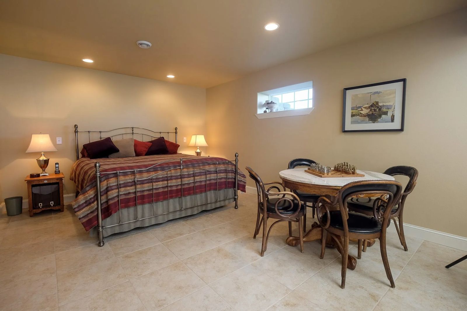 The details make for an amazing guest room. A king size bed finishes the plush touches of this spectacular light-filled space. In the morning, it’s as simple as waking up and opening the pocket doors to turn on the coffee pot in the nearby kitchenette. As Bruce mentioned, this could be “mother-in-law” accommodations. Absolutely nothing is amiss. It even comes with two sinks, one in the kitchenette and one in the bathroom.