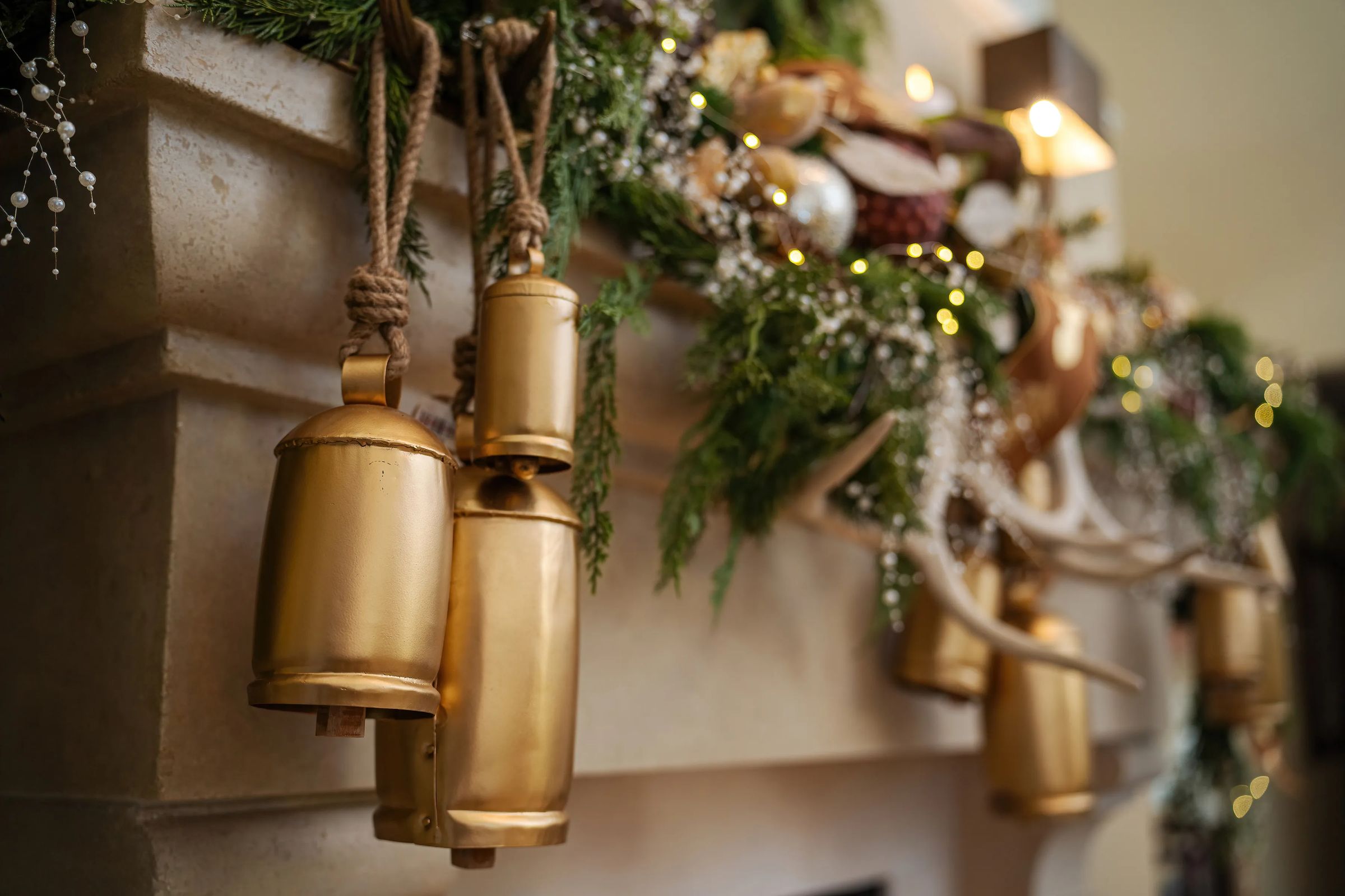 With its rustic wire edge ribbon woven throughout, large brass bells dangling from the display and faux tree branches that come completely covered with faux lichen, the result is an earthy yet high-end look.