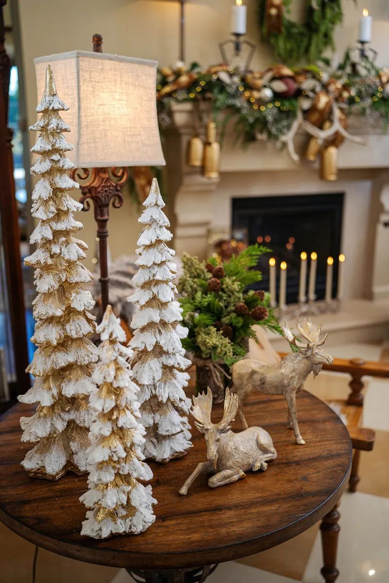 To carry this look to other portions of the home’s entry, there is a trio of wooden trees decked out with reindeer. Another spot features a fresh floral vase accented by faux greenery. When the white roses fade, simply add a few new fresh cuts to change up the look as the season moves on. And who wouldn’t notice the large hurricane vase sitting on the hearth?