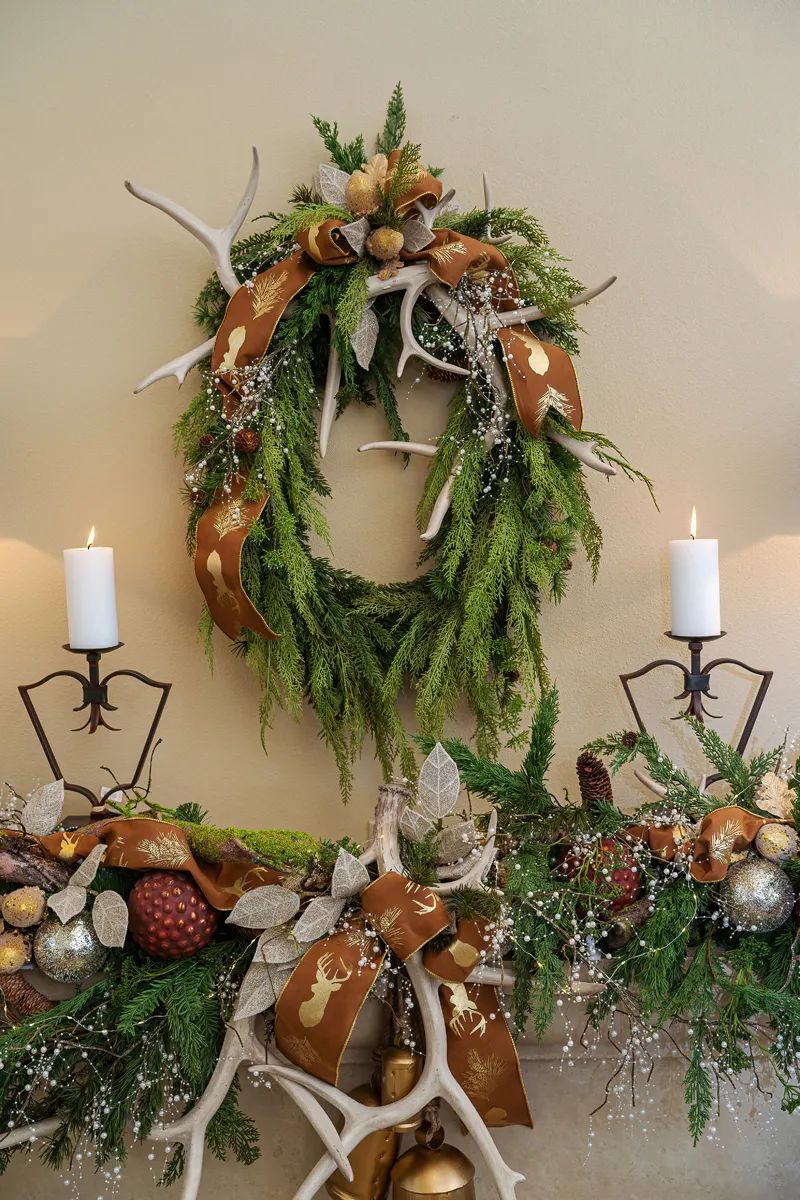 “This mantle has five different types of greenery along with the faux antlers,” Jim says. Rice lights add a soft glow. “The soft light really carries your eye through it, and the little white berries echo snow.”