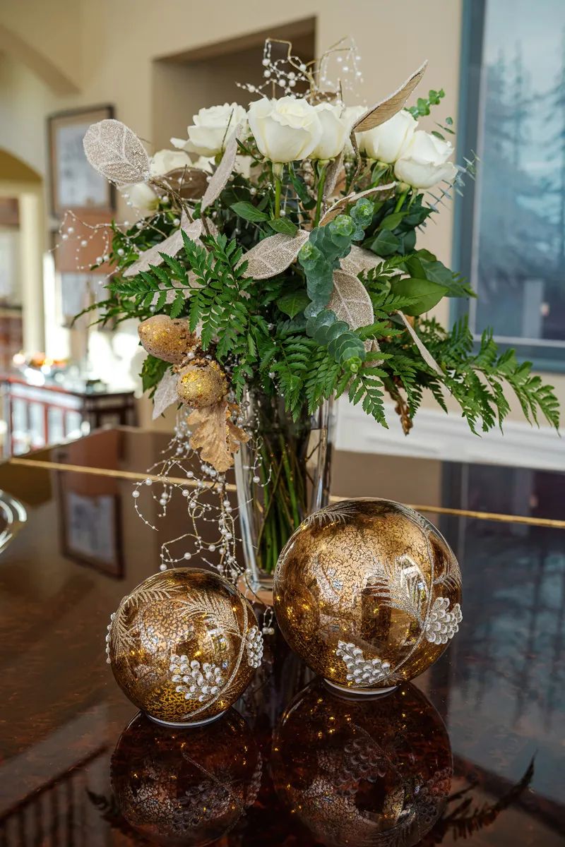 Glitter-dusted poinsettias, large, gilded leaves and splashes of metallic berries add to the holiday sparkle. Since many of us have some of these elements at home, Jim says why not take note of what you already have, adding maybe a few new elements to create the same more budget-savvy look.