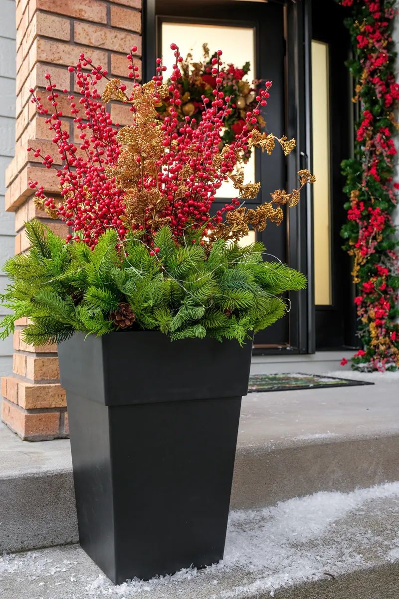 To add a little twinkle, battery-operated fairy lights are incorporated into the patio pots, the wreath and the garland on a timer to make sure they add just the right sparkle at just the right time of day. You’ll find all the same elements — berries, fir and eucalyptus — in every piece as well.
