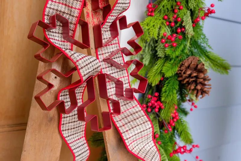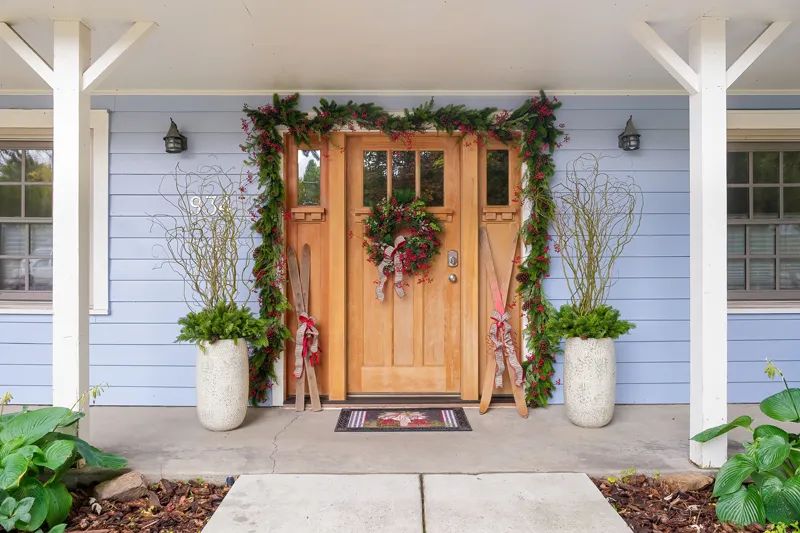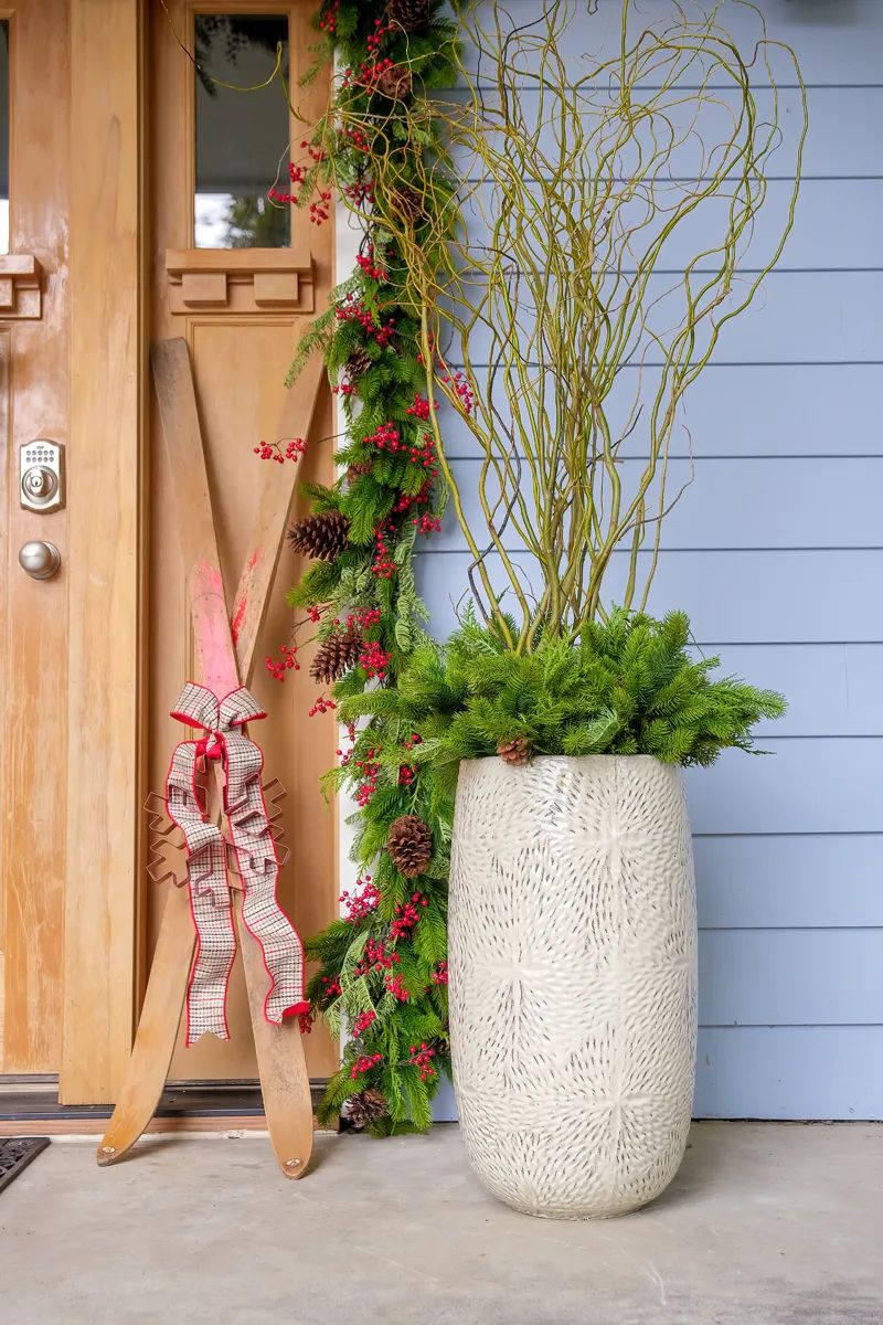 To make sure this door décor doesn’t look too dark, contrasting white patio pots filled with fir and curly willow add contrast, and a lighter tone of holiday ribbon accents the door. And then there’s the use of a family treasure to take this entryway to the next level — antique cross-country skis dressed for the holidays. There’s nothing more special than using old family heirlooms in holiday décor.