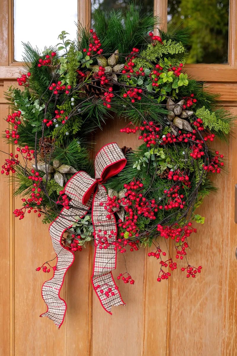 “You can’t help but get that warm Christmas feeling from this look,” Jim says as he points out the three types of evergreen foliage — cedar, ponderosa pine and fir. Add in some bold red berry clusters and pinecones and you have a rustic look that perfectly dresses this natural mission-style wood door.