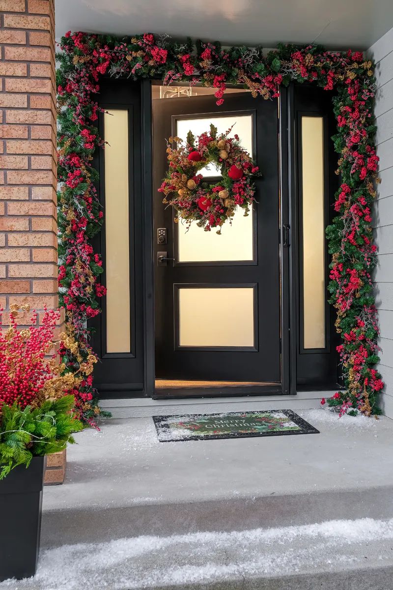 For starters, you can’t go wrong by wrapping your door frame with garland. You can surround the entire door or, as you’ll see with our modern look, just the door’s header for a more subtle flair. Second, add a wreath. Third, make a statement by dressing up your patio pots for the season. Lastly, change up your door mat to one with a holiday vibe. All three looks we showcased have these four elements, and as you are about to see, all have their own unique feel.