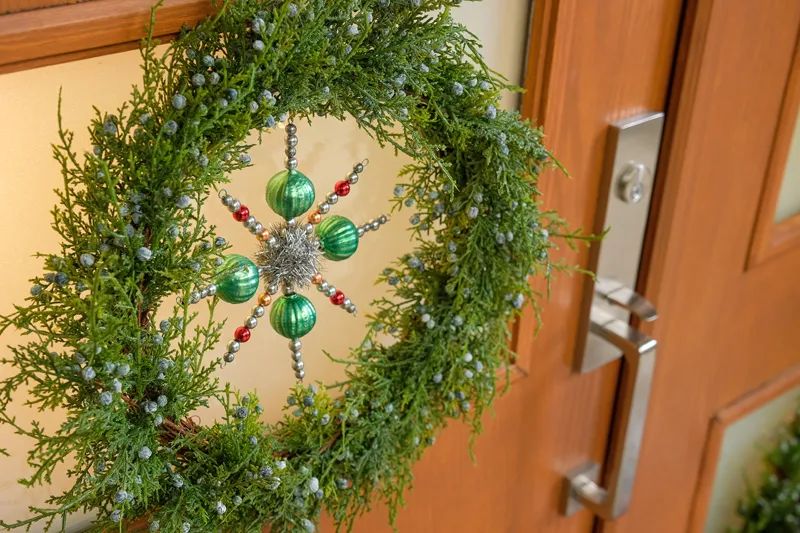 Instead of using two wreaths, here you’ll find six mini juniper wreaths set in each of the door’s window panes and decked out with ornaments both big and small.
