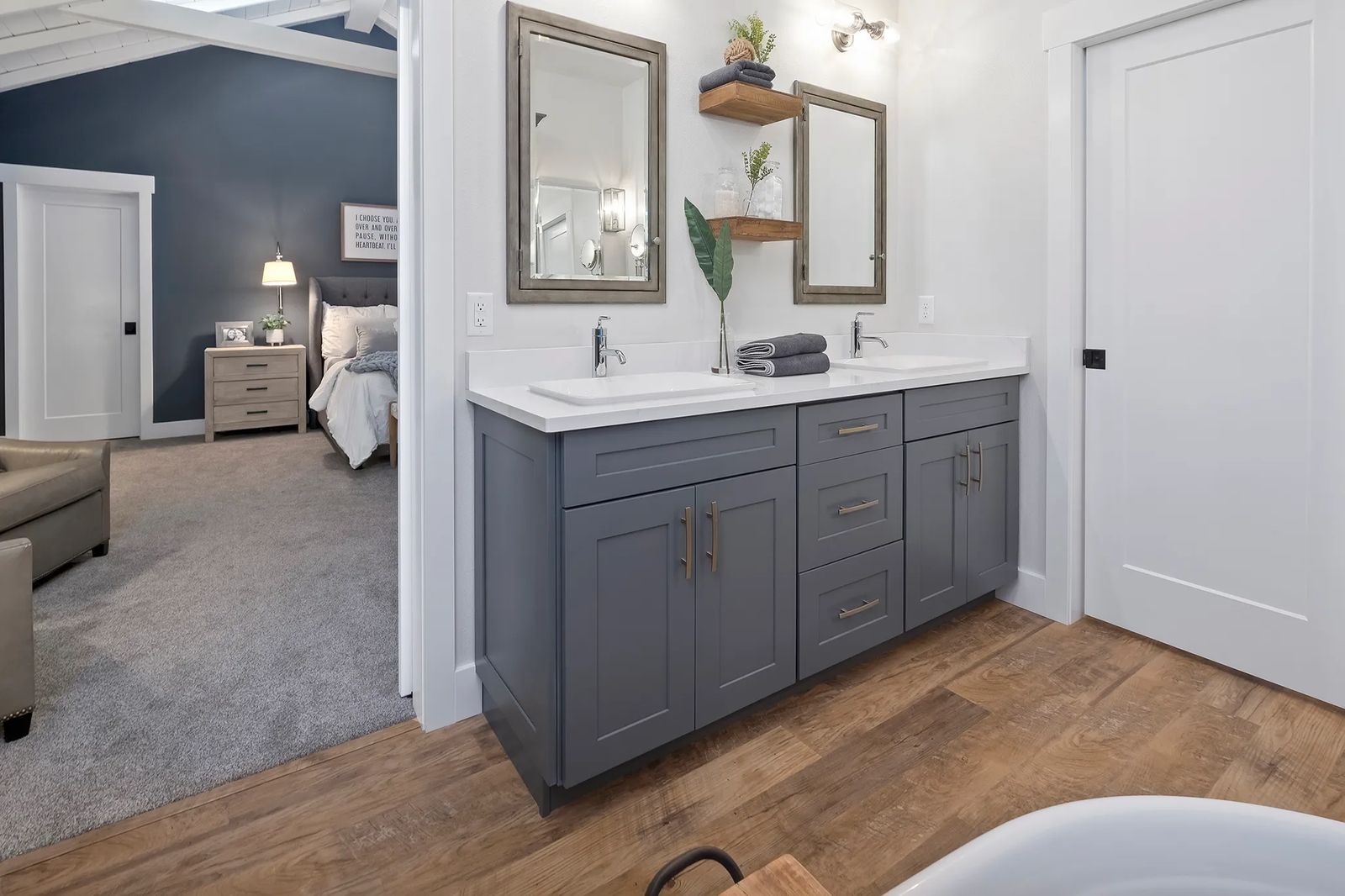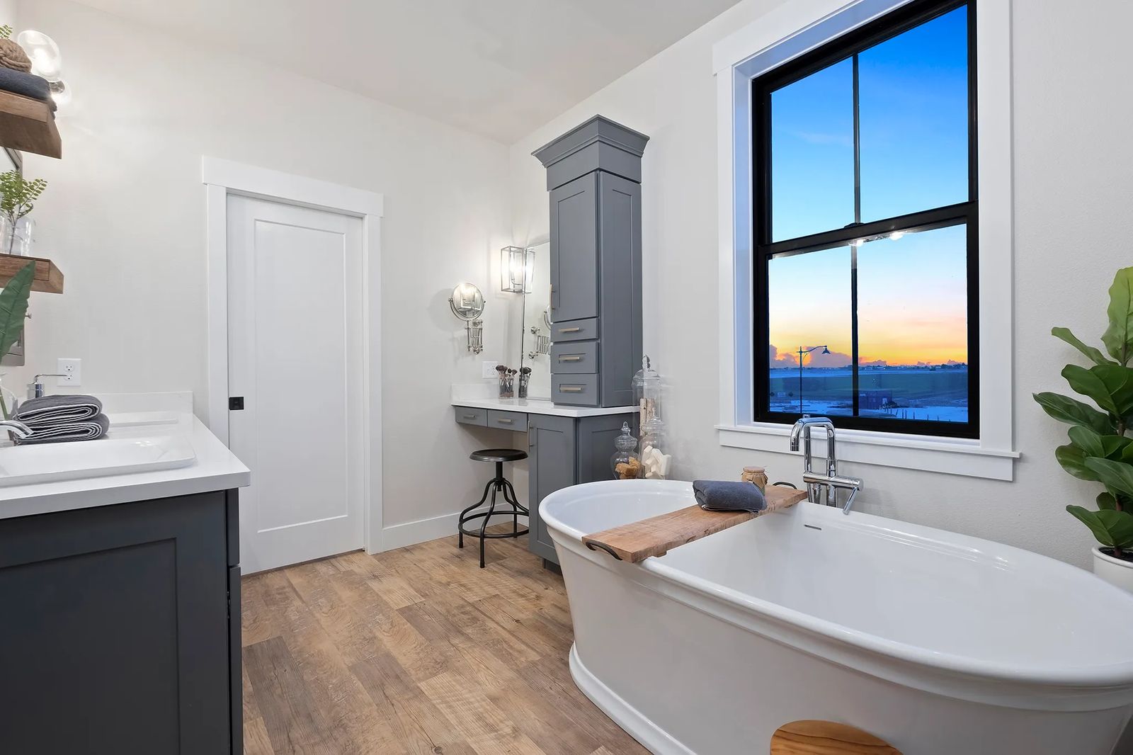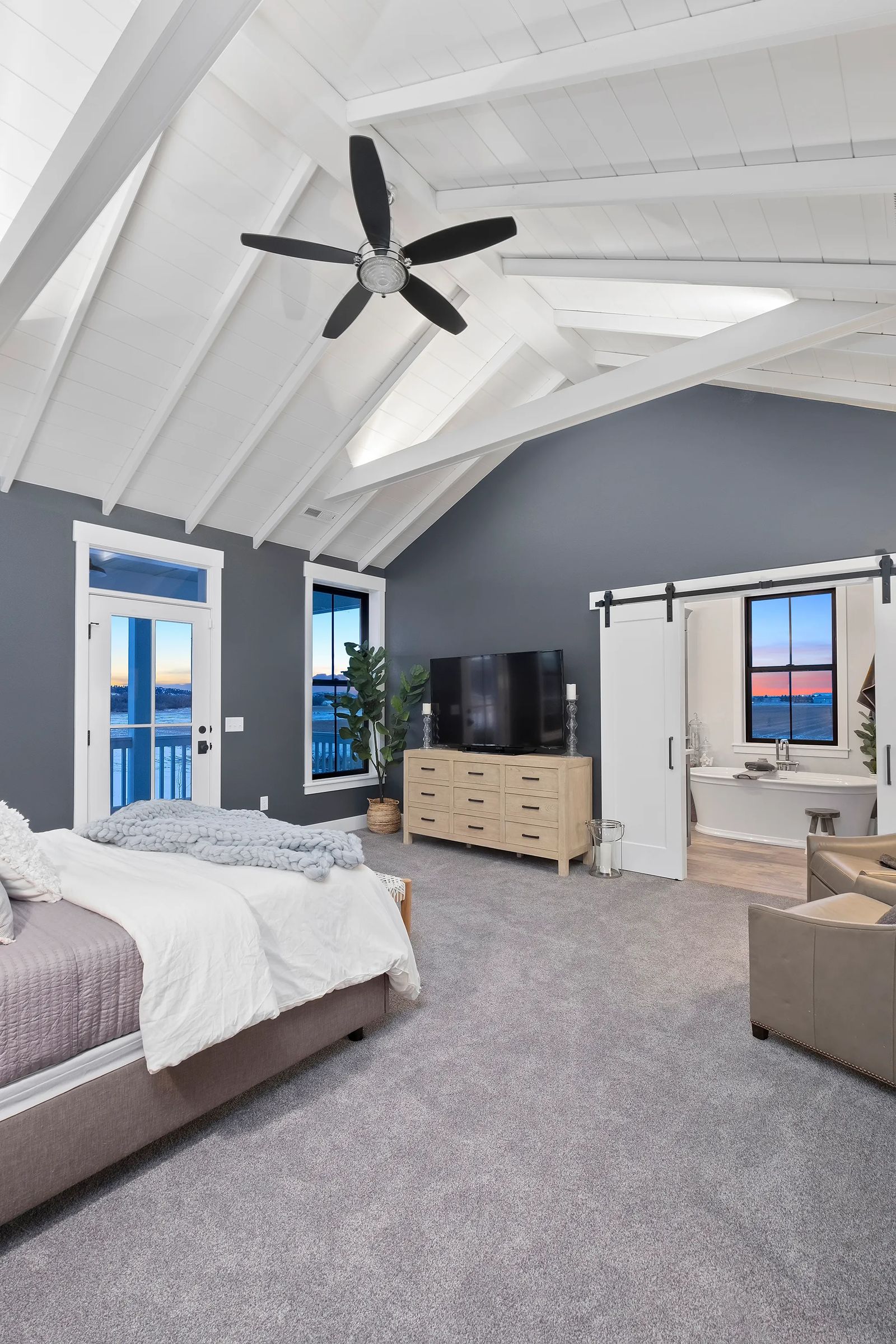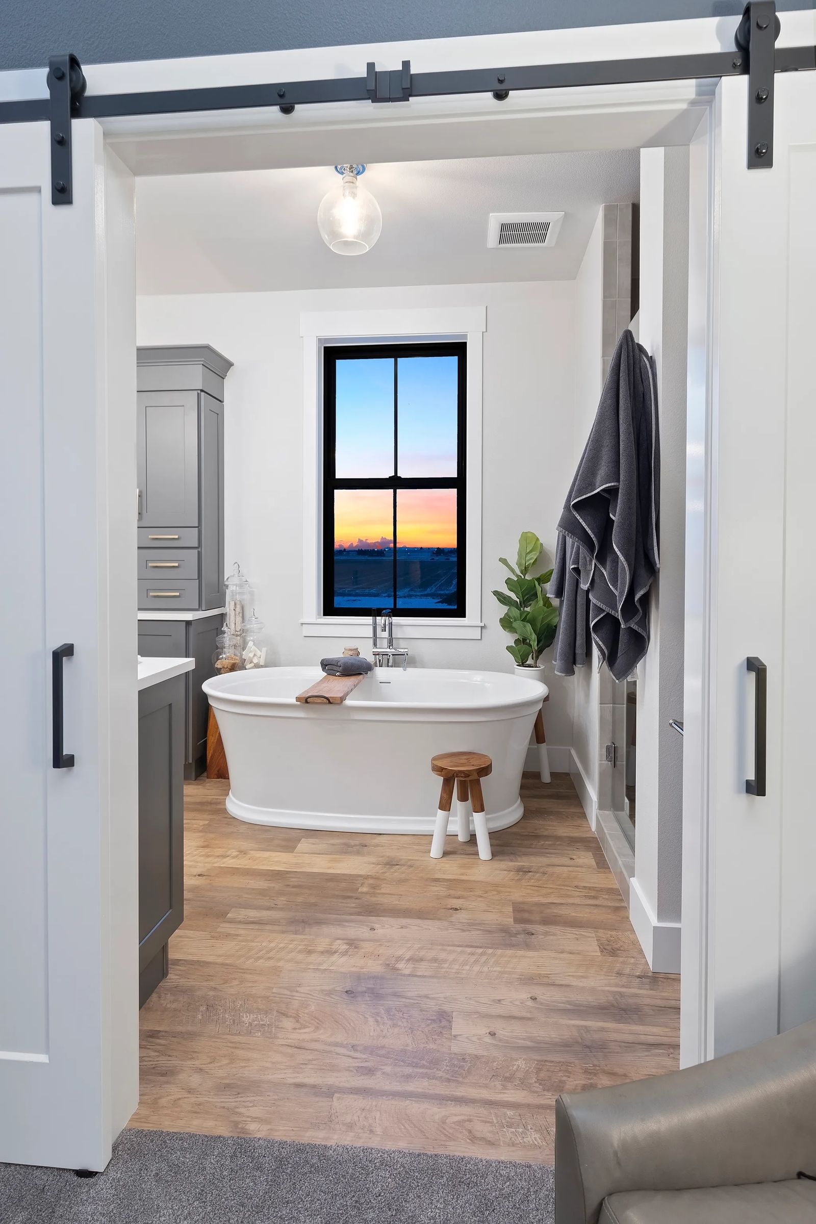 Even the elegant en suite with white sliding barn doors offers a bountiful view of the outdoors. The spa-like bath sparkles with white quartz countertops; built-in medicine cabinets; floating vanity and soaker tub. Shiplap embellishes the space.