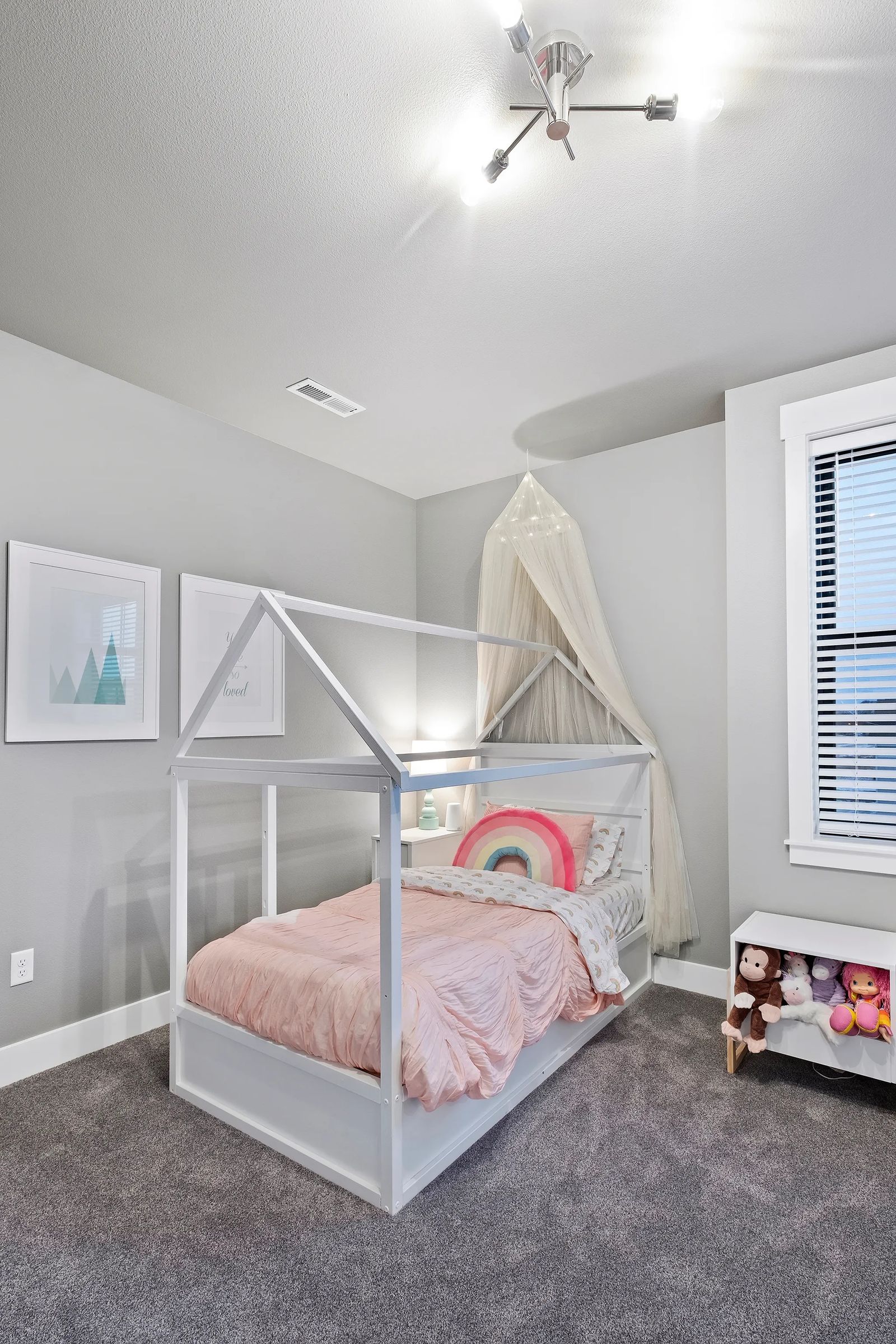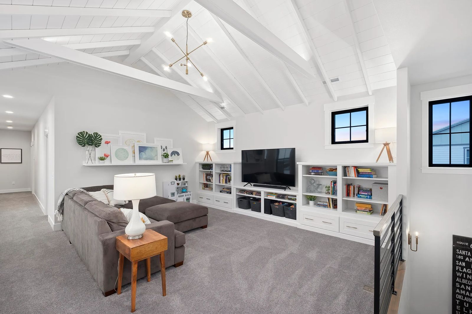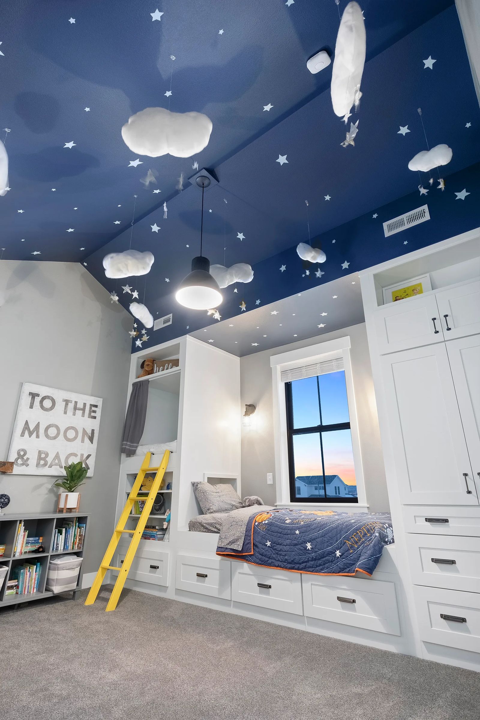 The kids love their bedrooms, but the family gathering spot takes center stage. The family room features a lighted, open beam shiplap ceiling. This space is intentionally positioned between the kids’ bedrooms and mom and dad’s retreat.
