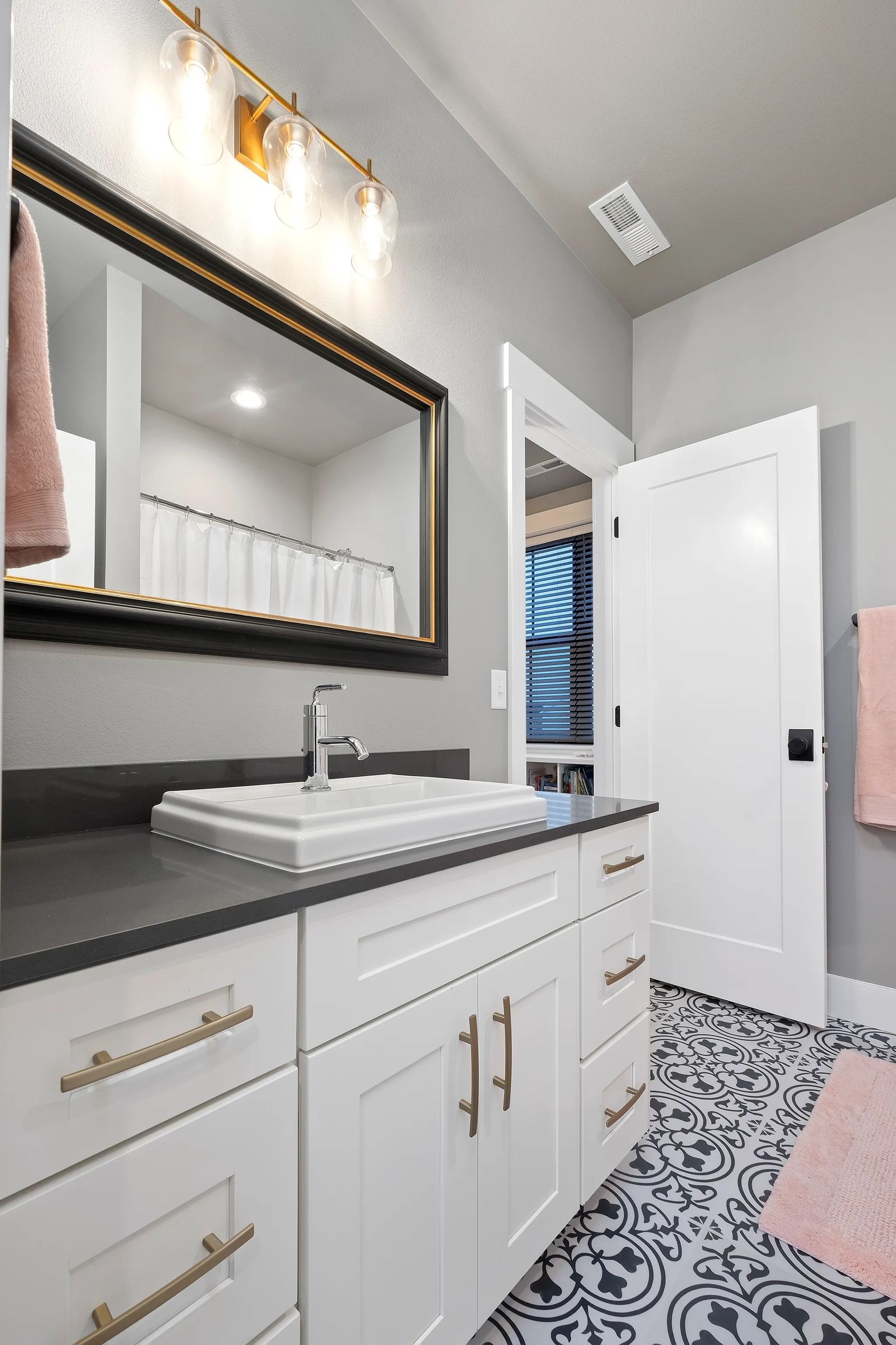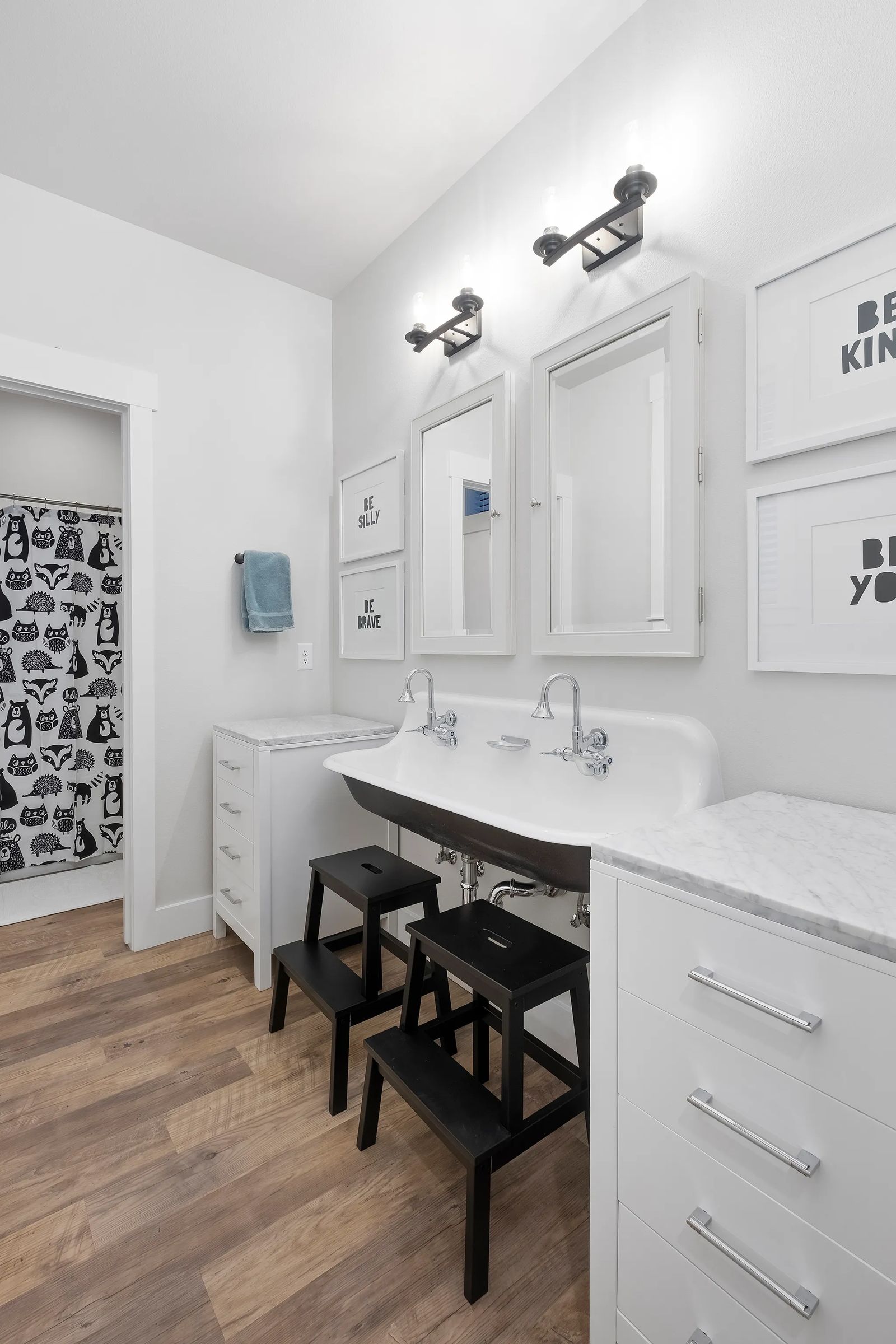 One-year-old Skylar’s bedroom, with a bright orange and white tepee in one corner, is just across the hall. The boys share a bathroom. A trough sink sporting two separate faucets with two built-in medicine cabinets overhead gives them plenty of elbow room. Two step-stools slide beneath. Free-standing cabinets grace each side.