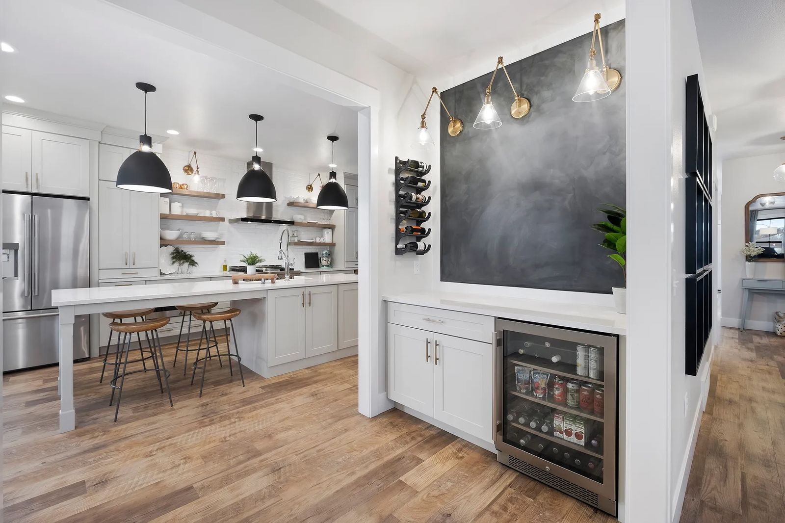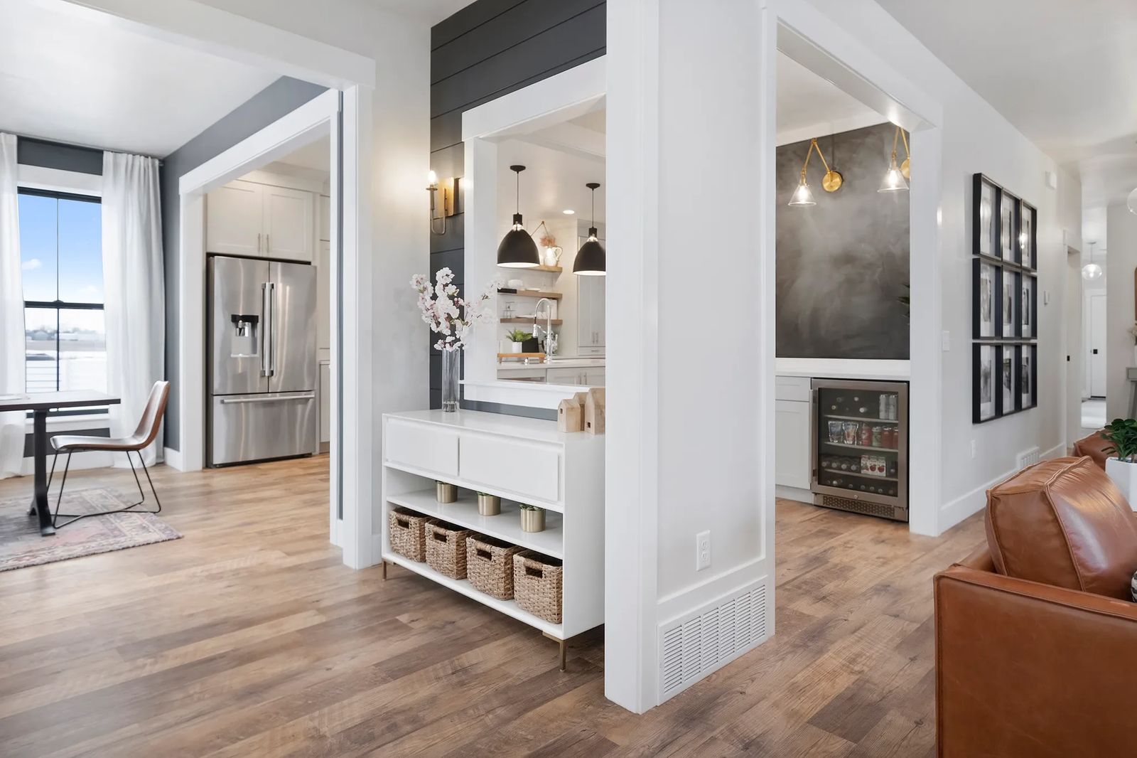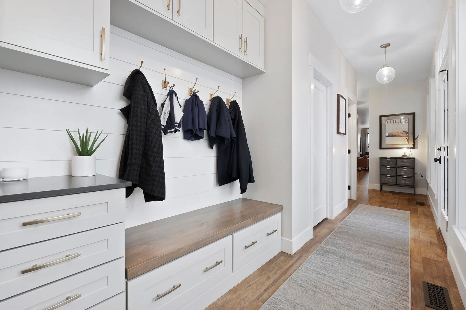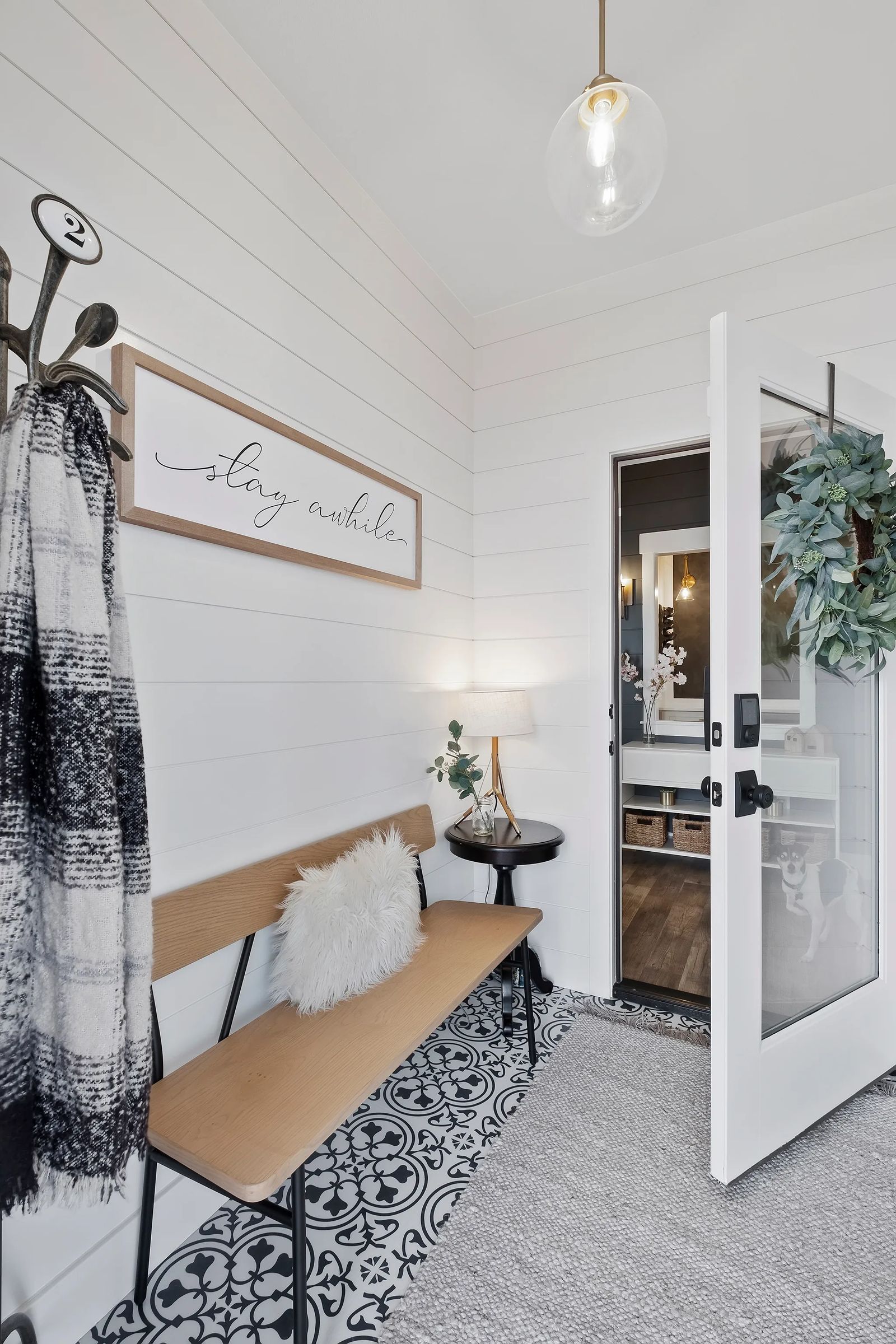 The shiplap Carolee creatively employs throughout the home creates an upscale farmhouse ambiance. “You first get the texture of shiplap coming into the house from the vestibule,” Carolee says.