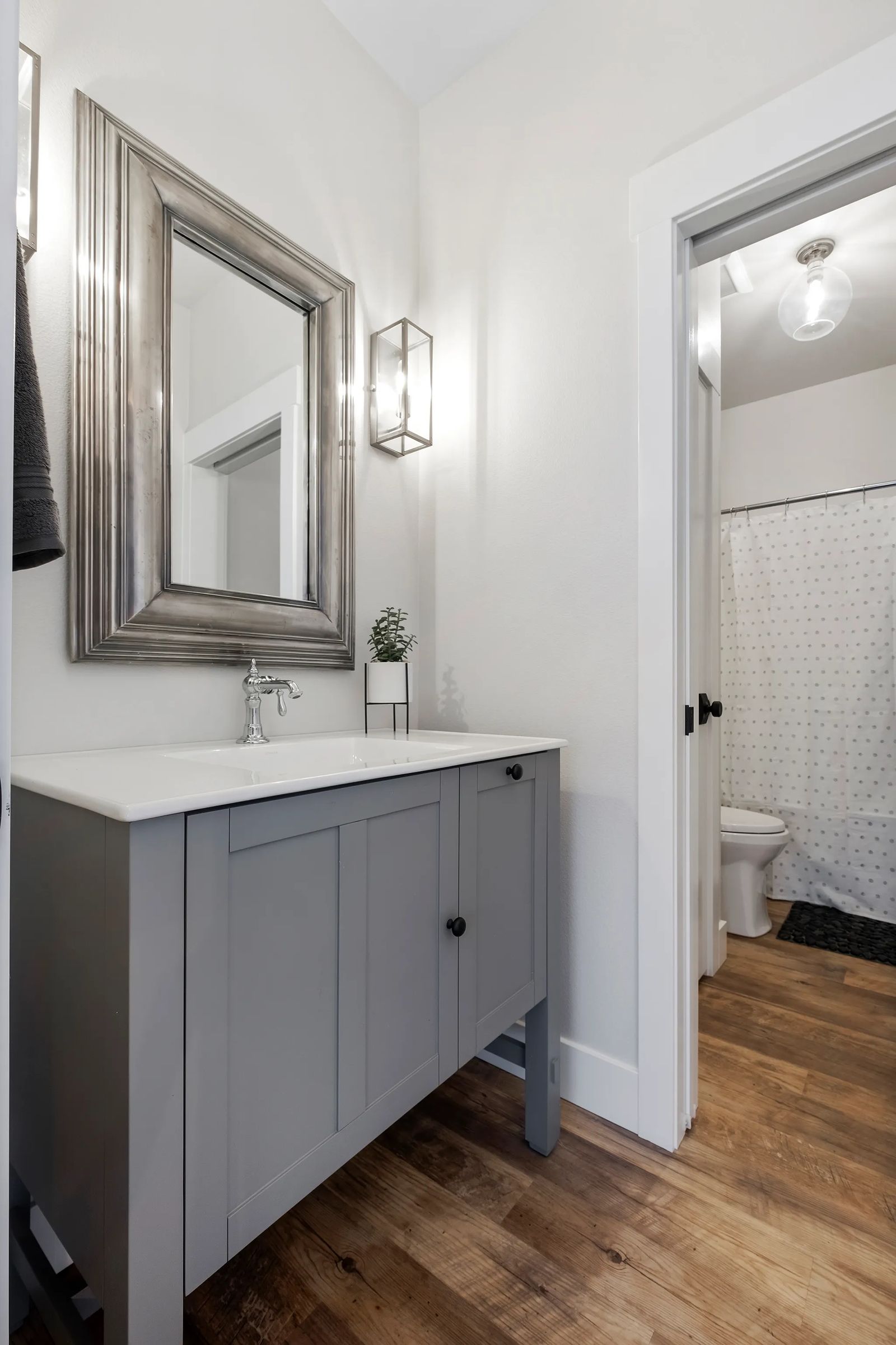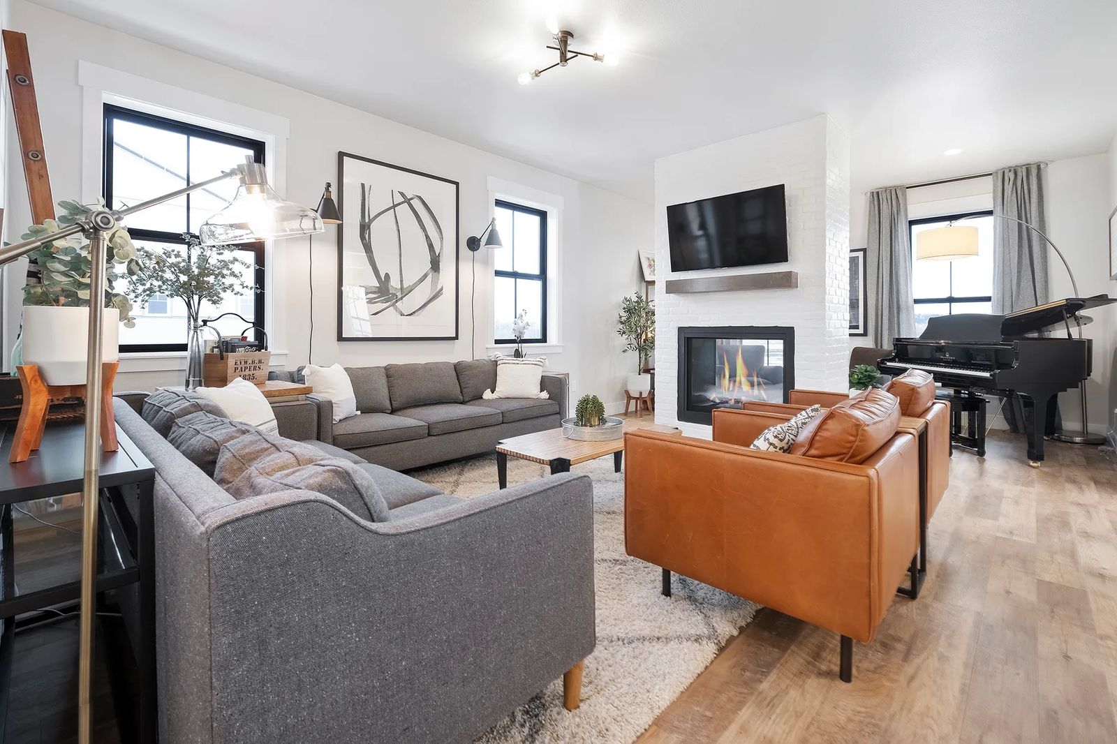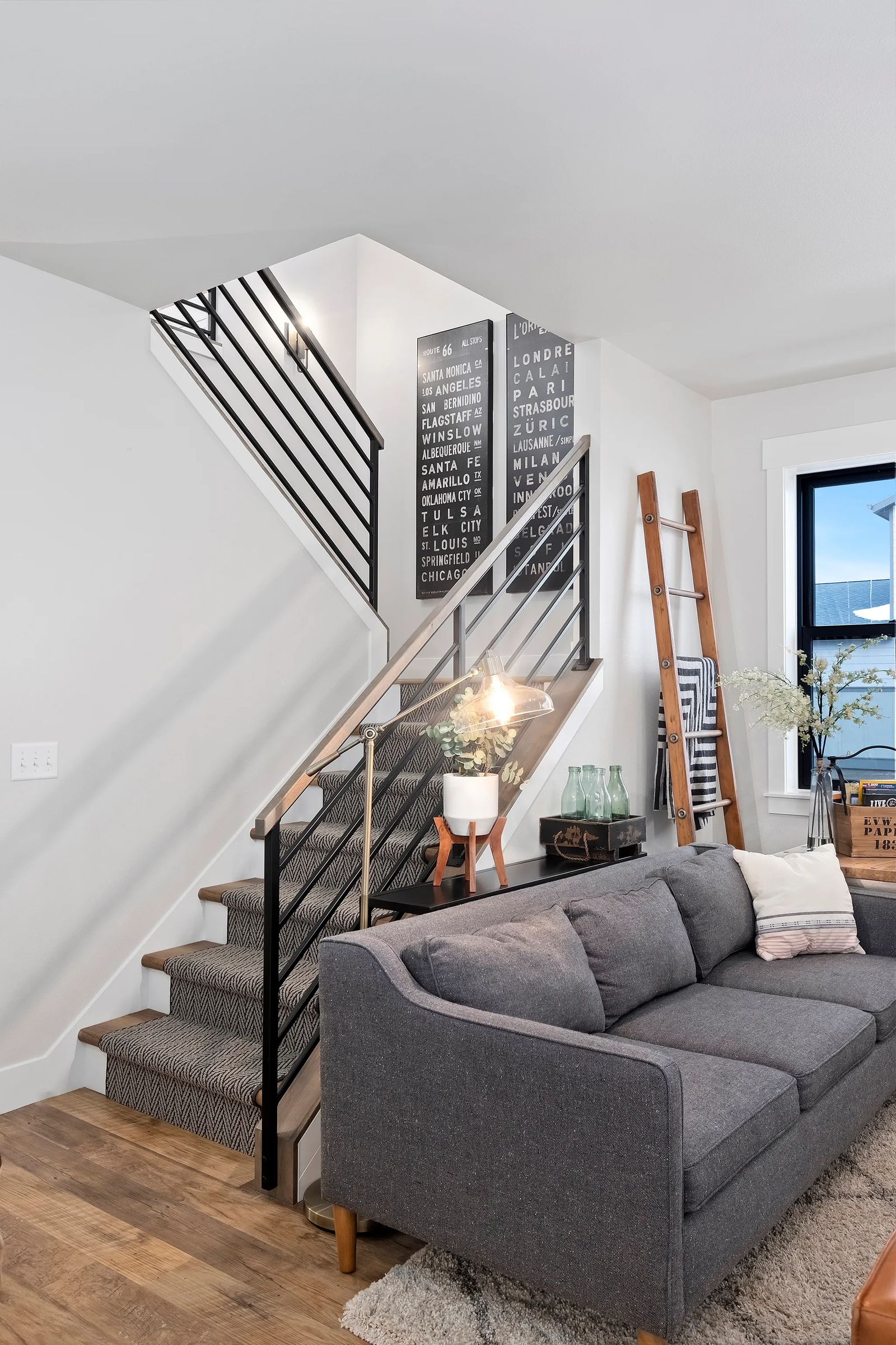 Neutral gray sofas play well with dark blue-gray “Peppercorn” paint. Gray, this designer’s favorite color, lends warmth to the home’s color palette. Luxury Vinyl Plank (LVP) flooring covers the first floor and gray carpeting on the second floor supplies another layer of texture.