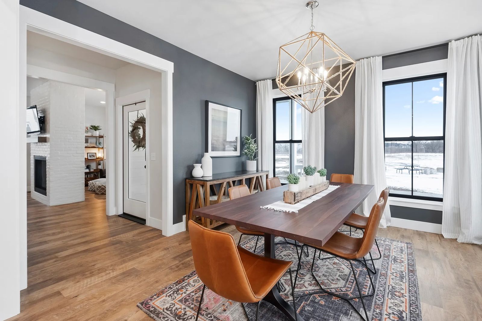 Floor-to-ceiling white draperies in the dining area enhance the beauty of this energy-efficient ComfortBuilt home by McCall Homes.