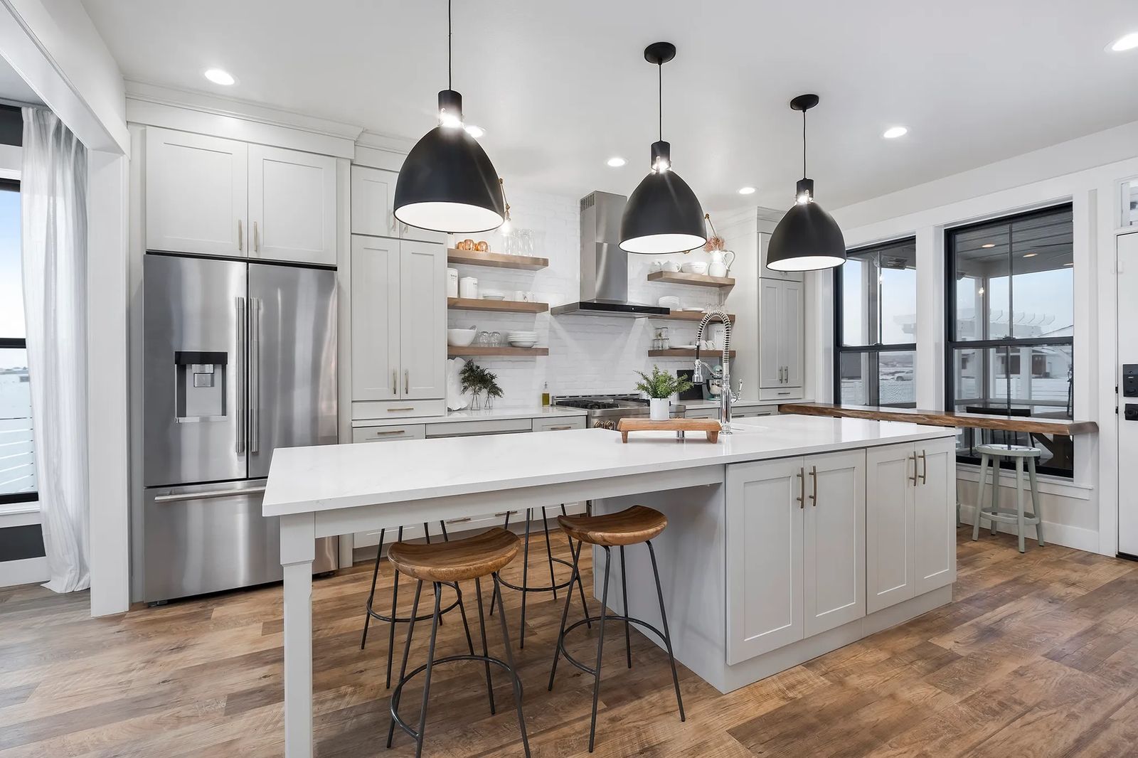 In the open concept kitchen/dining area, Carolee points out the gloss quartz countertops and the smooth texture of large pendant lights. All of the quartz countertops in the home come from Fabricators Unlimited and all of the lighting from One Source Lighting, including a rope-wrapped geometric-shaped chandelier hanging above the dining table.