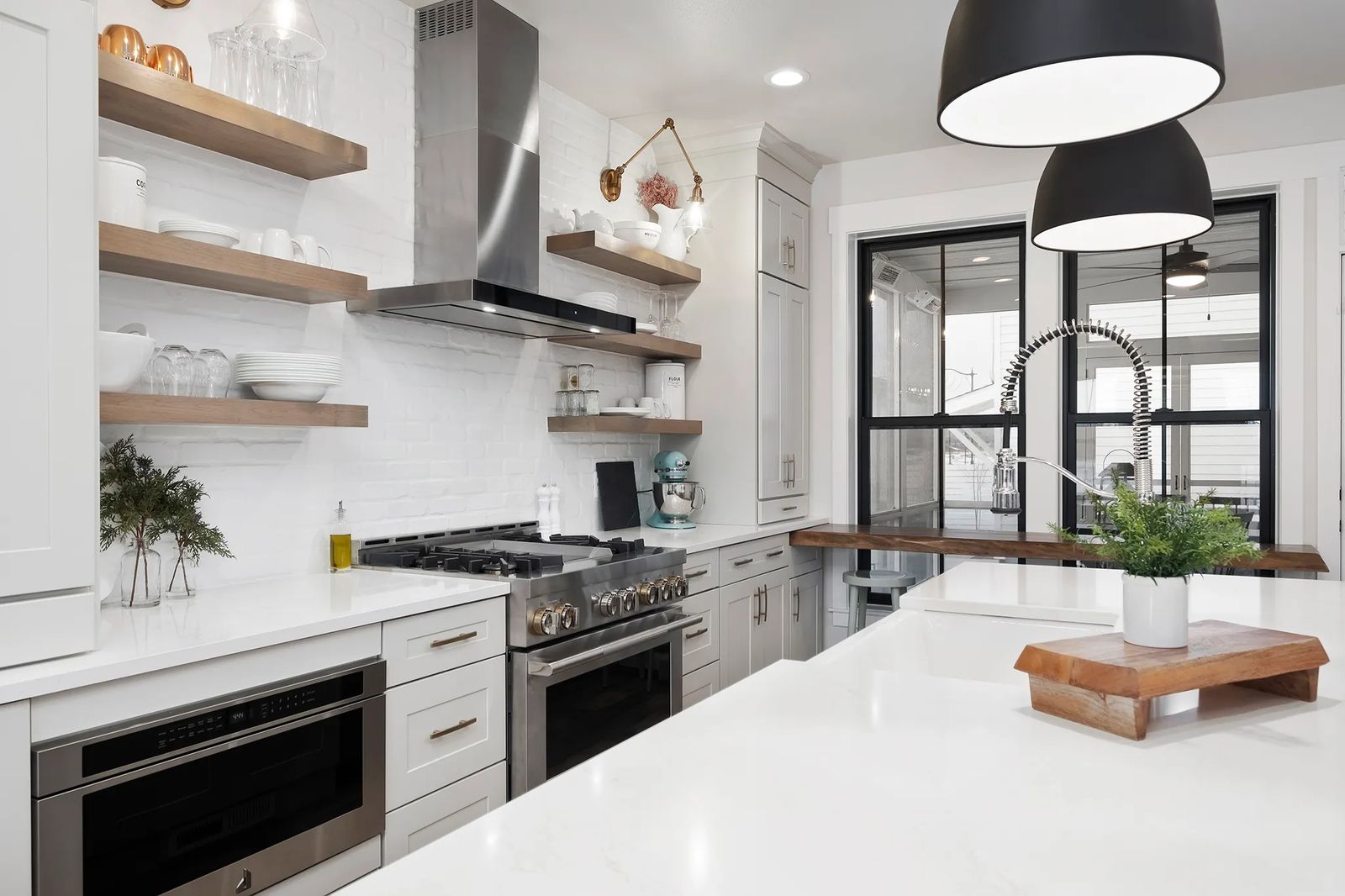 The workspace in this functional kitchen boasts stainless steel JennAir appliances from Ferguson Bath, Kitchen and Lighting Gallery. “They’re Wi-Fi,” Carolee says. “I can preheat the oven with my phone, pick up the kids and grab a frozen pizza.”