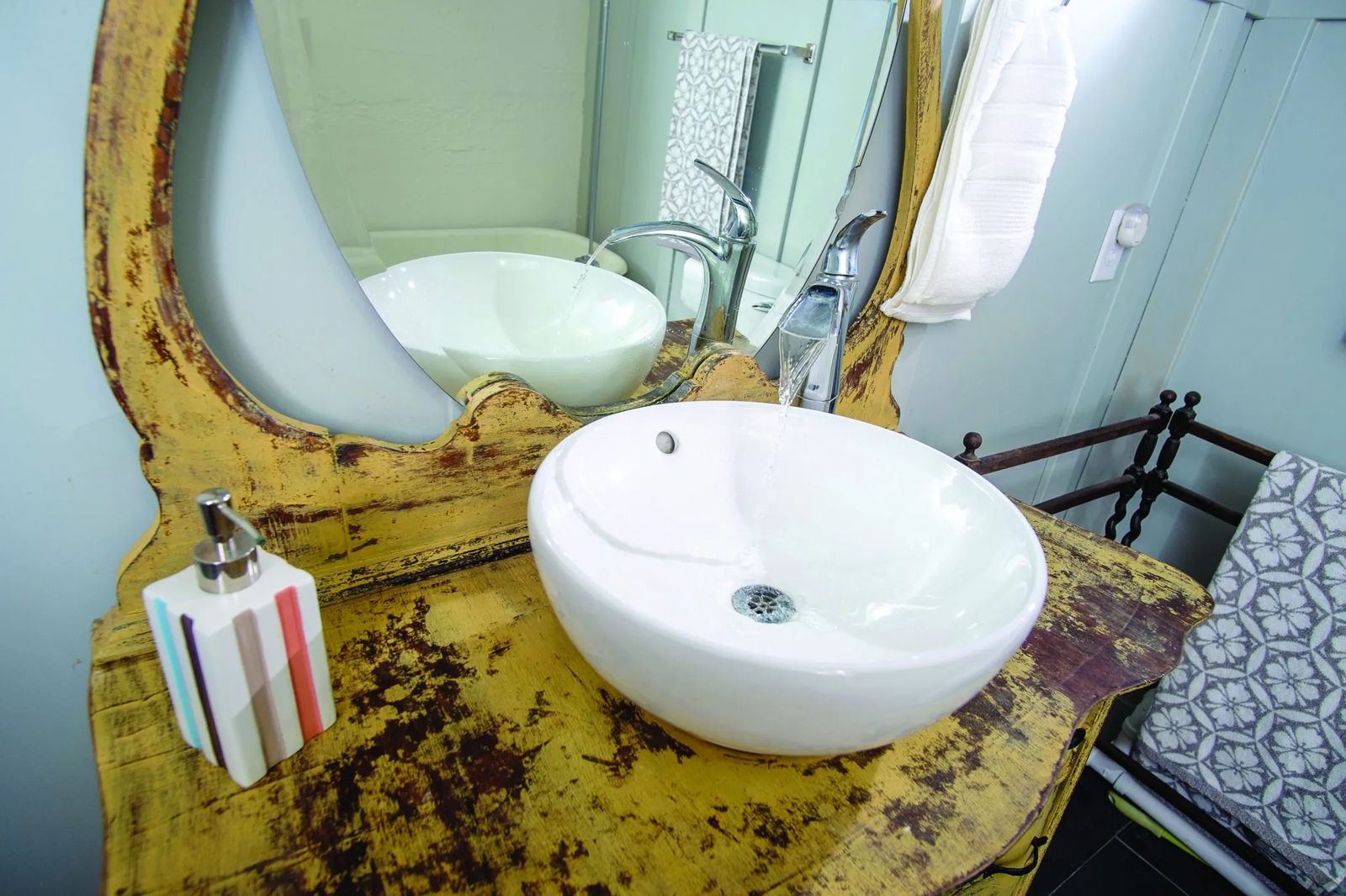 Keep in mind the functionality of each drawer as you go. This will vary because of each dresser’s unique measurements and drawer depth. Mark and use a jigsaw to cut out the back. Move the dresser to its permanent position and attach the faucet and plumbing. Find the studs in your wall and screw two screws through the back of the vanity into the studs to firmly attach to the wall.