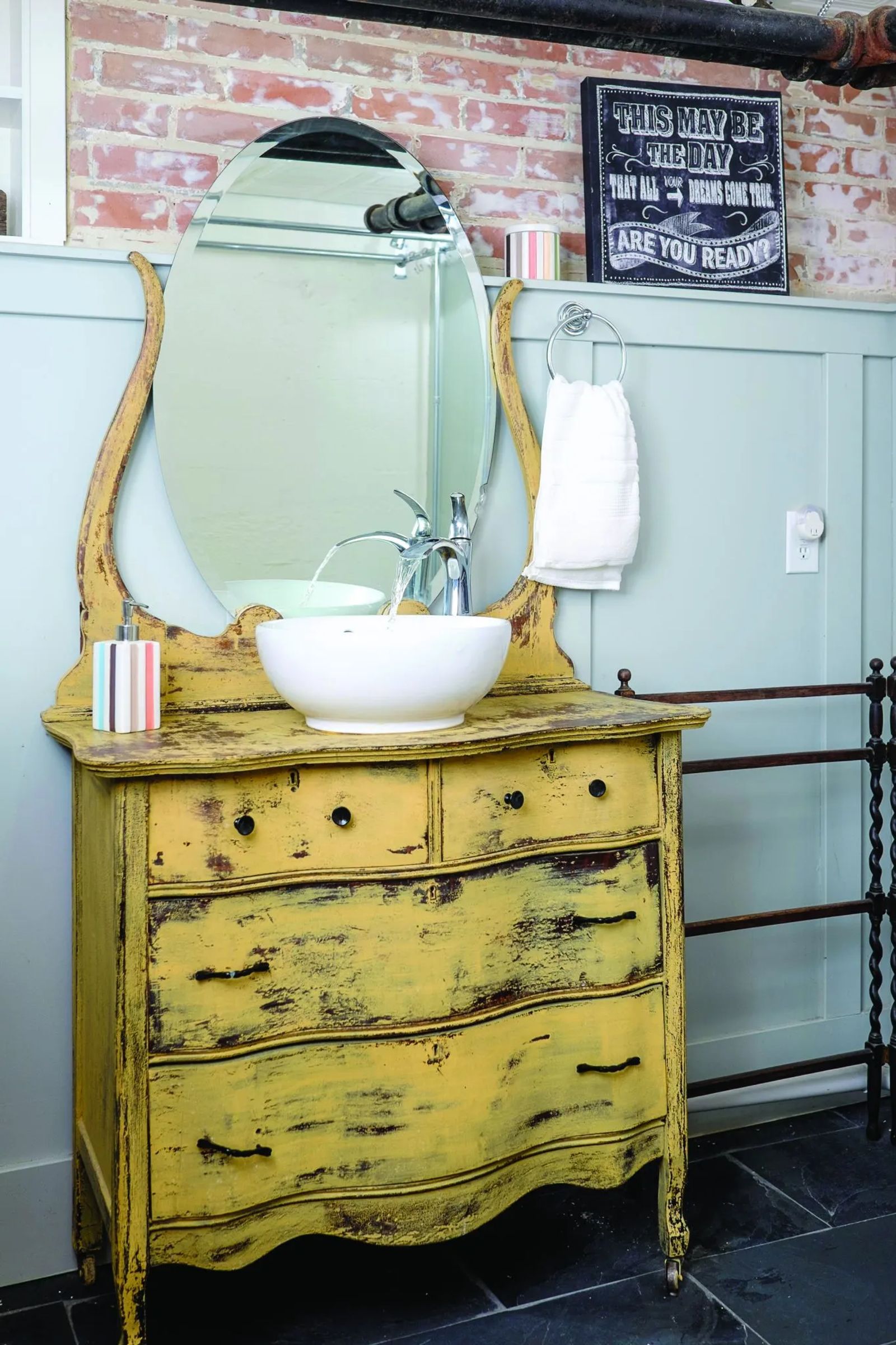 Always looking for a new way to use old things, I stumbled upon a decorating trend that can easily add character to a ho-hum bathroom. In the market for a new bathroom vanity, I discovered that some designers were giving new life to old dressers by fashioning them into vanities. A fun vintage piece that started its life as one thing, can easily turn into another. Not only beautiful, this trend is functional as well. You have the look of a furniture piece but with plenty of storage as well. This is much better than your built-in traditional bathroom cabinet in my book. It’s exactly why my husband and I decided to tackle this for our own bathroom.